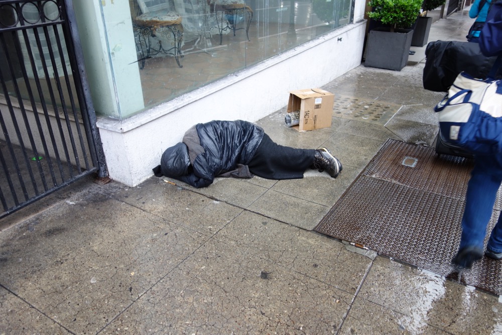 DSC08569How depressing. Why doesn’t he sleep under one of the overhangs or doorways? I understand he probably gets kicked out when the businesses open up, but there are still so many closed store fronts right now since it’s so early.