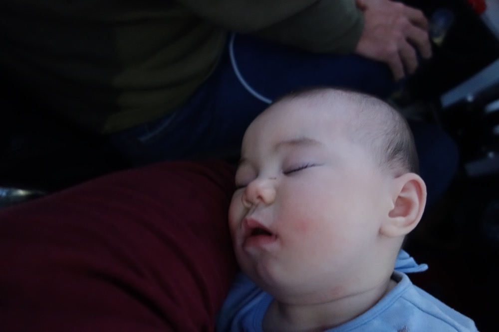 DSC08633Asleep, but restlessly. Despite the loud plane, she kept on getting woken up by other people talking or coughing.