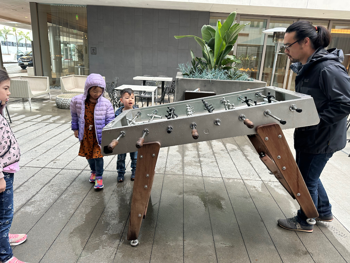 Draining out all the water accumulated on the foosball table. Since it rained last night, after coffee, we couldn’t go to the park so we came back to our hotel to play some foosball until our next mystery activity opened up.