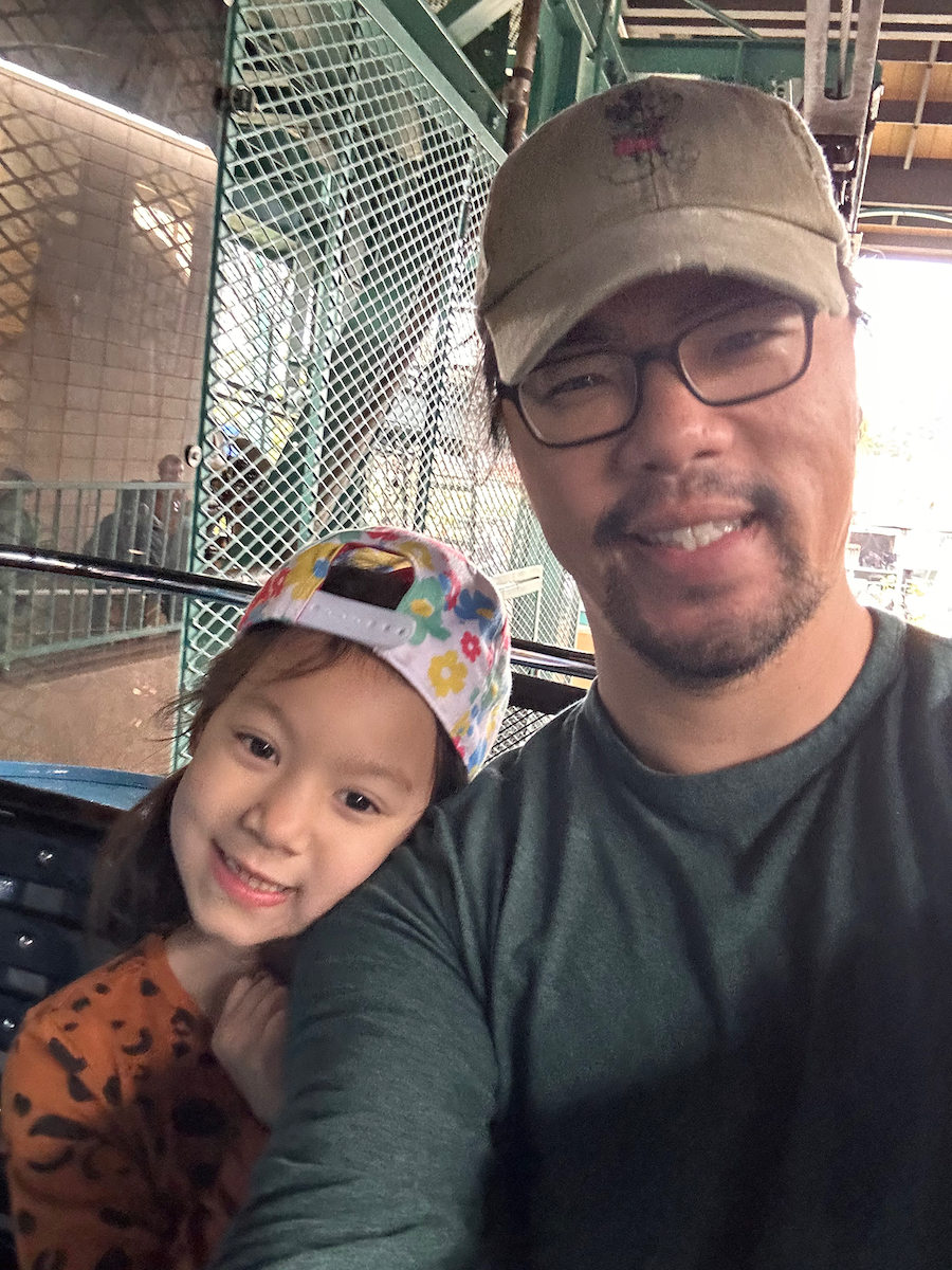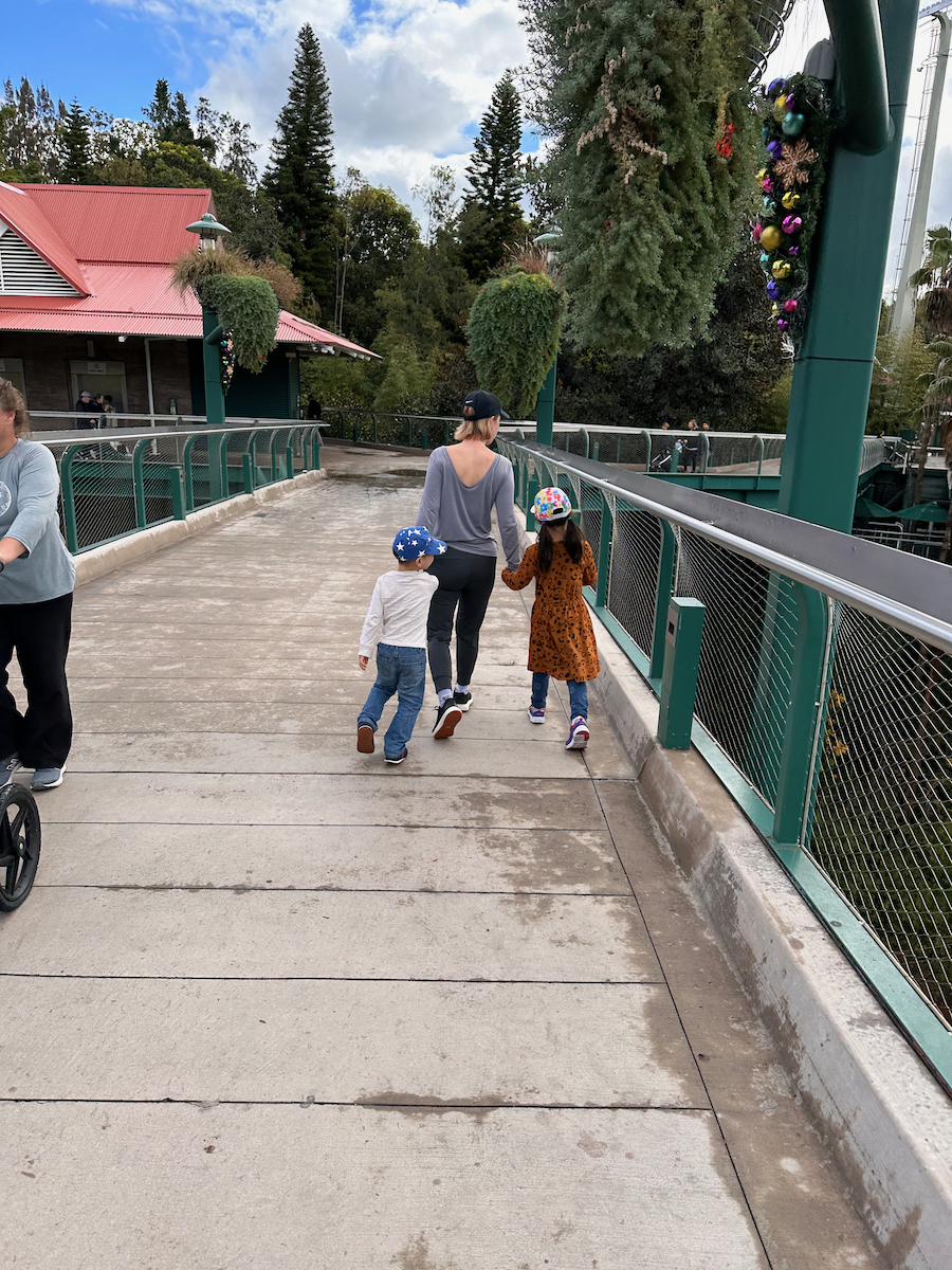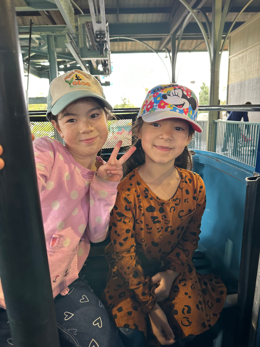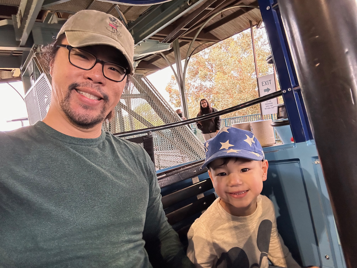 Of course, once we got to the end of the line, we had to make a return trip since our stroller is still at the other station. Instead of just riding all the way around, we had to exit and get in line again. This side of the line is longer than the other side, but still only about 10min. It felt like forever, the kids are really really really acting up today. We are both parenting really hard and the kids are just not listening and fighting with each other nonstop.