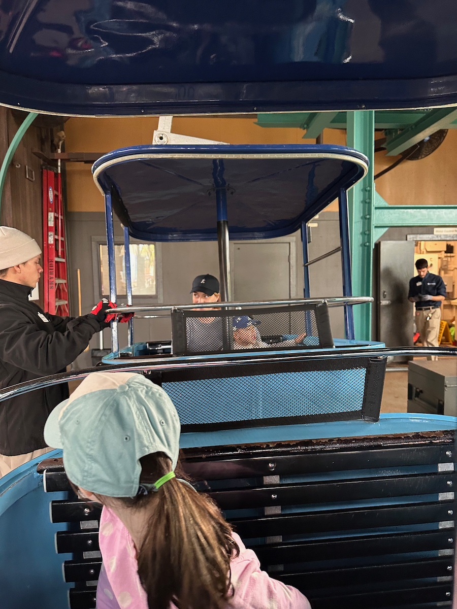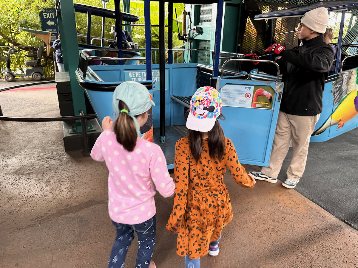 The girls really wanted to ride in the flamingo cart, and as luck would have it, it came right when it was our turn.