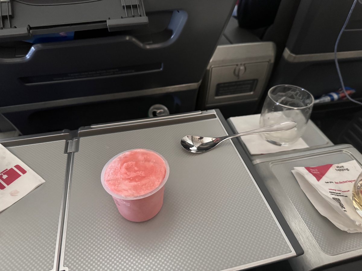 I did also get a raspberry sherbet with my meal though. Oh yeah, there’s also a magnetic spot on the tray, you can see that the spoon is magnetized and stopped from not falling over the side.