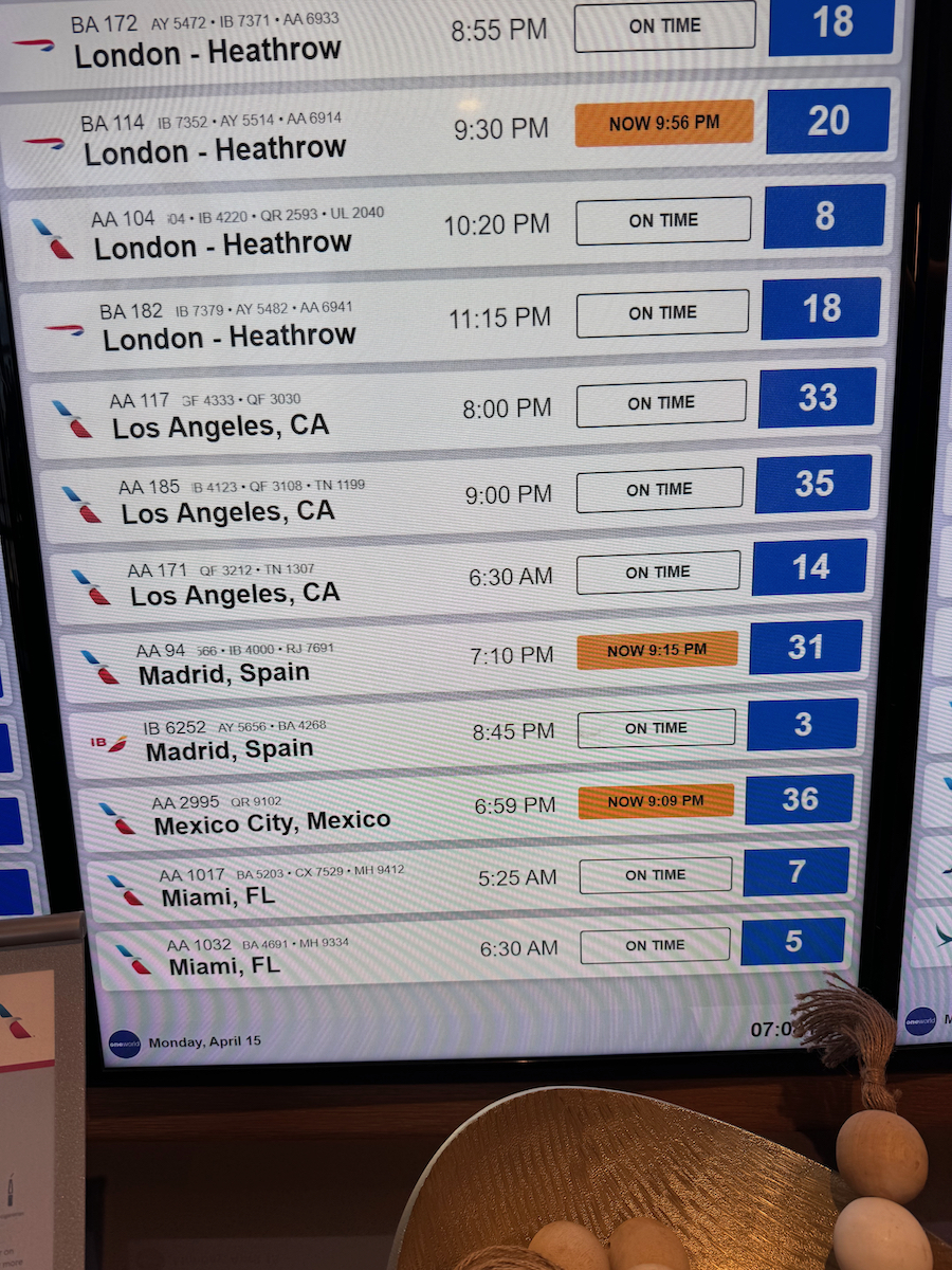 Shit! Now it’s been delayed more. Now it’s 2 hours behind schedule. It may be cutting it tight for our connection whether we need to go through passport checks and security again. I went to the AA desk to ask about the Madrid airport and whether we needed to go through another passport check prior to connecting to Morocco, they didn’t know anything. I guess we’ll just have to wing it and figure it out once we get there and hope for the best.