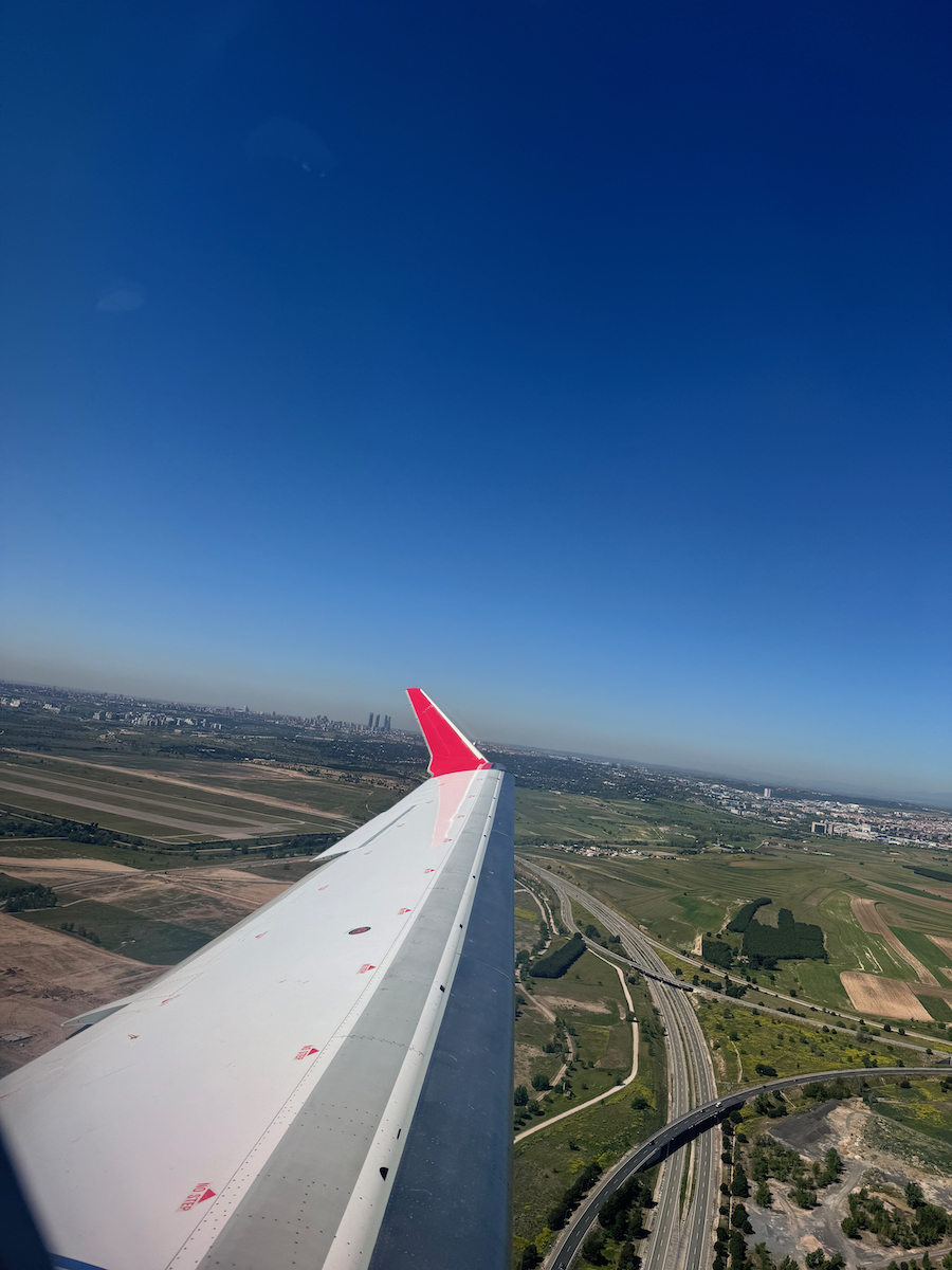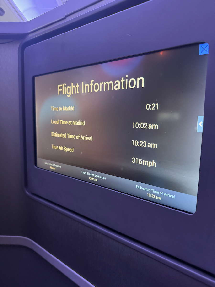 The captain for the flight came on the announcement and gave reasons for the delay. The original captain was sick, so they called up the alternate pilot. Somehow, the first alternate couldn’t make it and they didn’t find that information until it was too late. And at that point, they called up the second alternate, who is our current Captain. He said that he got the call, and was out the door of his house in 12 minutes to make it to the airport. The plane also took on a little more fuel to fly faster to make up for lost time. With the estimate that they have, we should make it to Madrid with 1 hour and 20 minutes for our connection. I am hopeful that we’ll be able to do that.