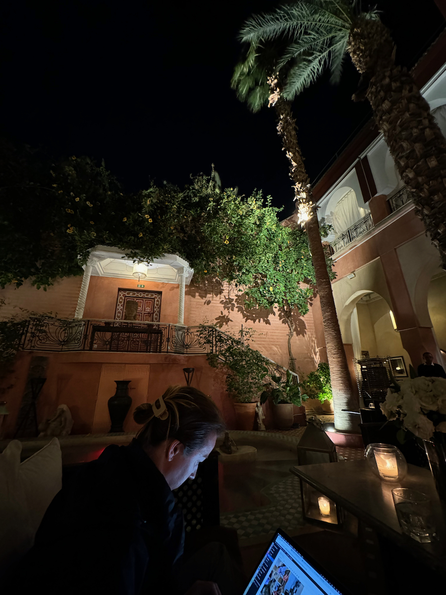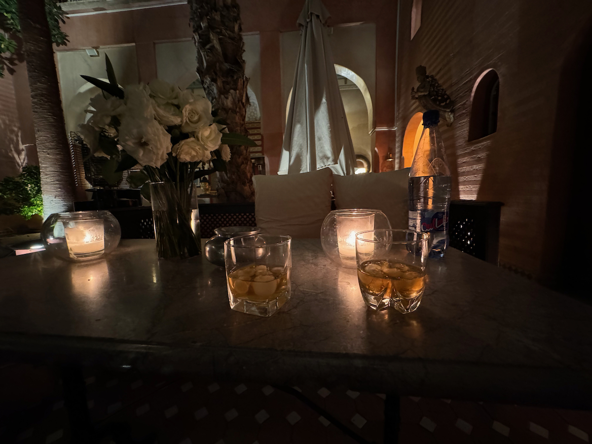 Now down by the center courtyard a bit later. Keep those drinks flowing please, it’s been a long day of traveling, and we are kinda bummed out about Marrakesh right now.