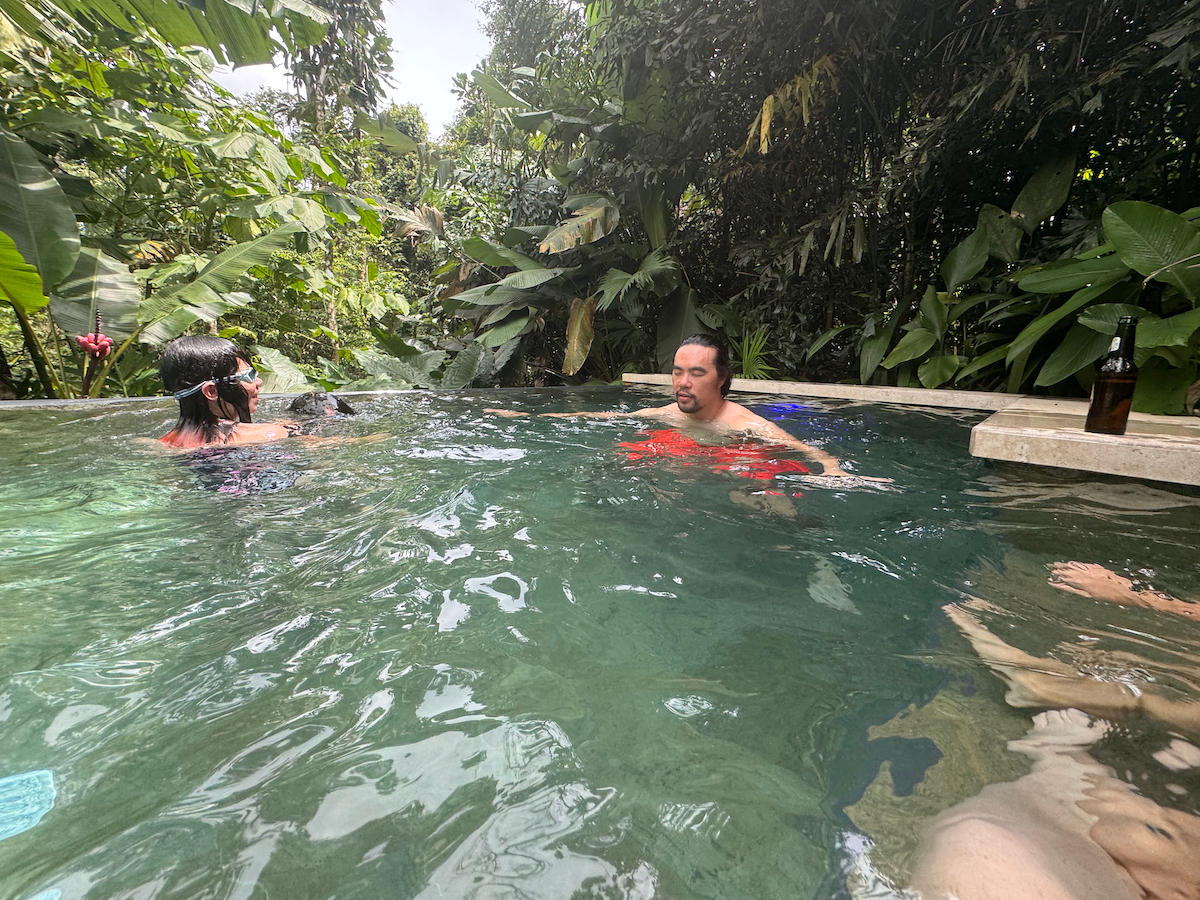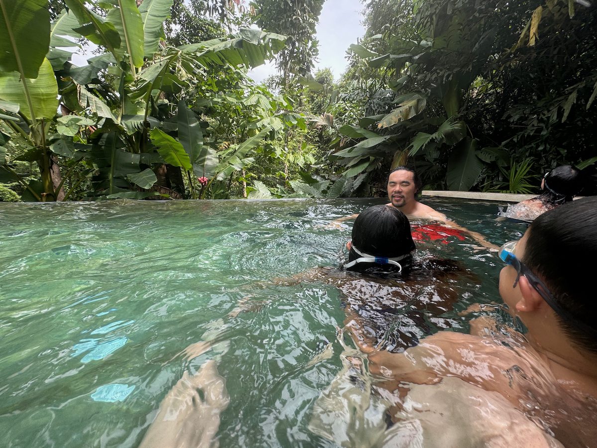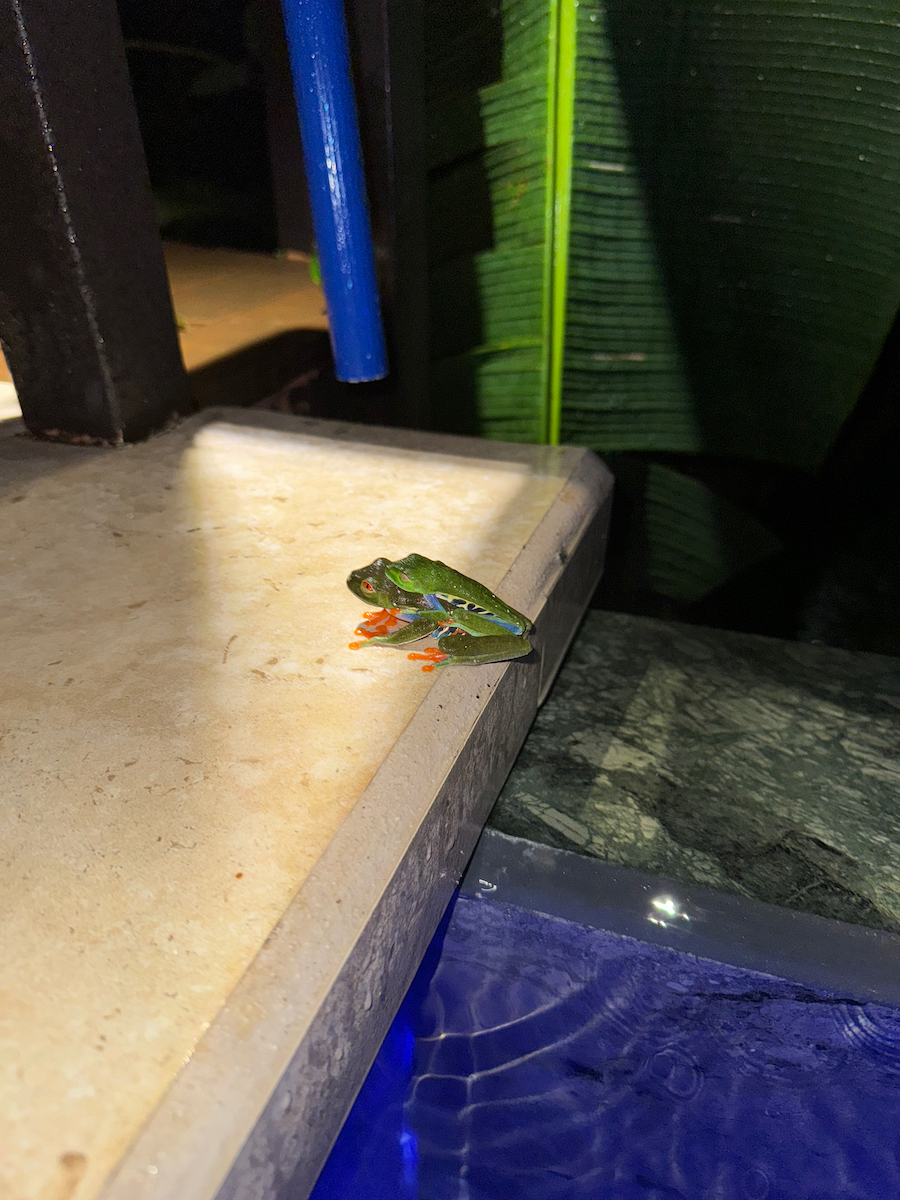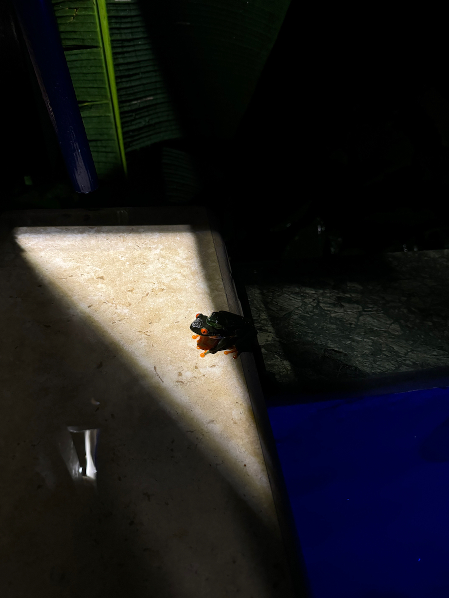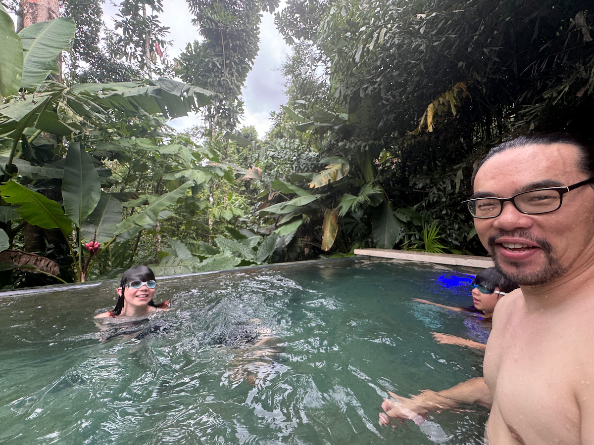 Then it started raining, like it does in rainforests. Magical. The rain hits the surface of the water and we see splashes of glow as it refracts the underwater pool light. It feels like we are inside the Avatar movie Pandora with the plants, rain, frogs sounds, bird sounds, insect sounds, etc. etc. It’s just a fantastic experience out here.