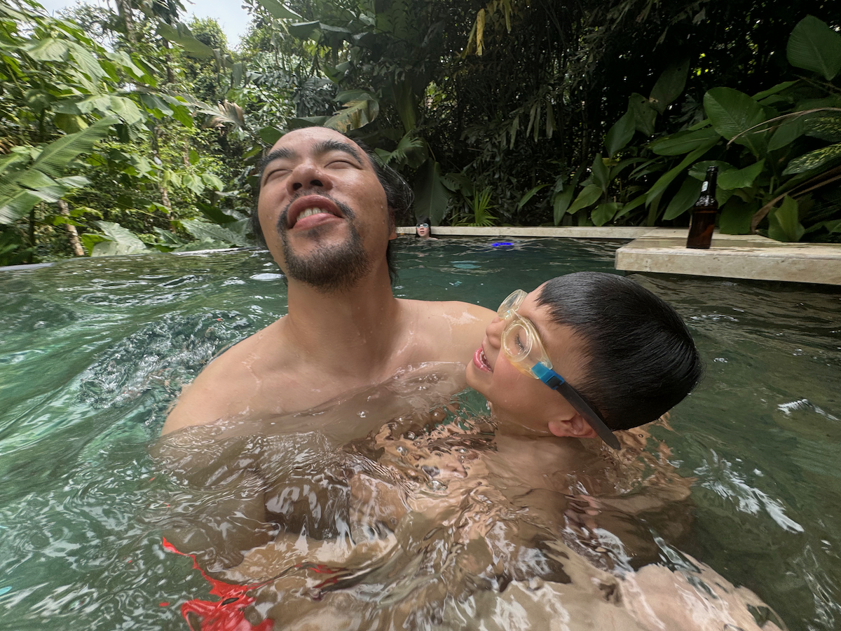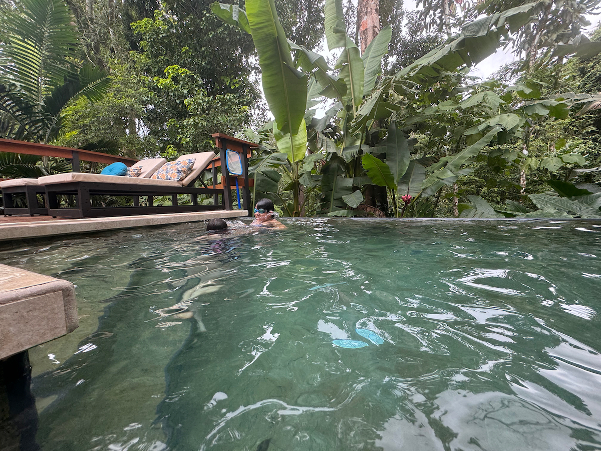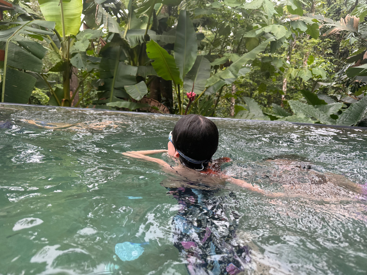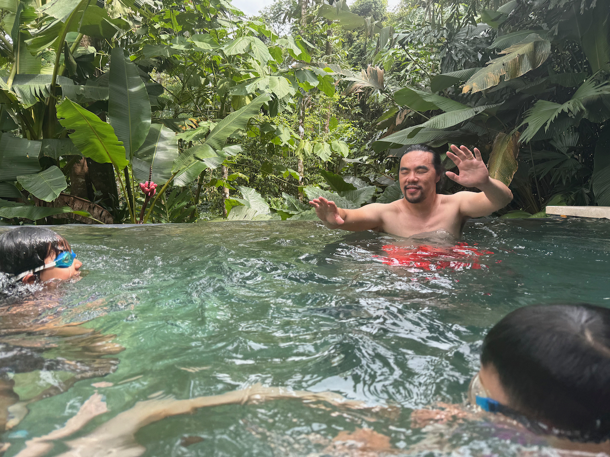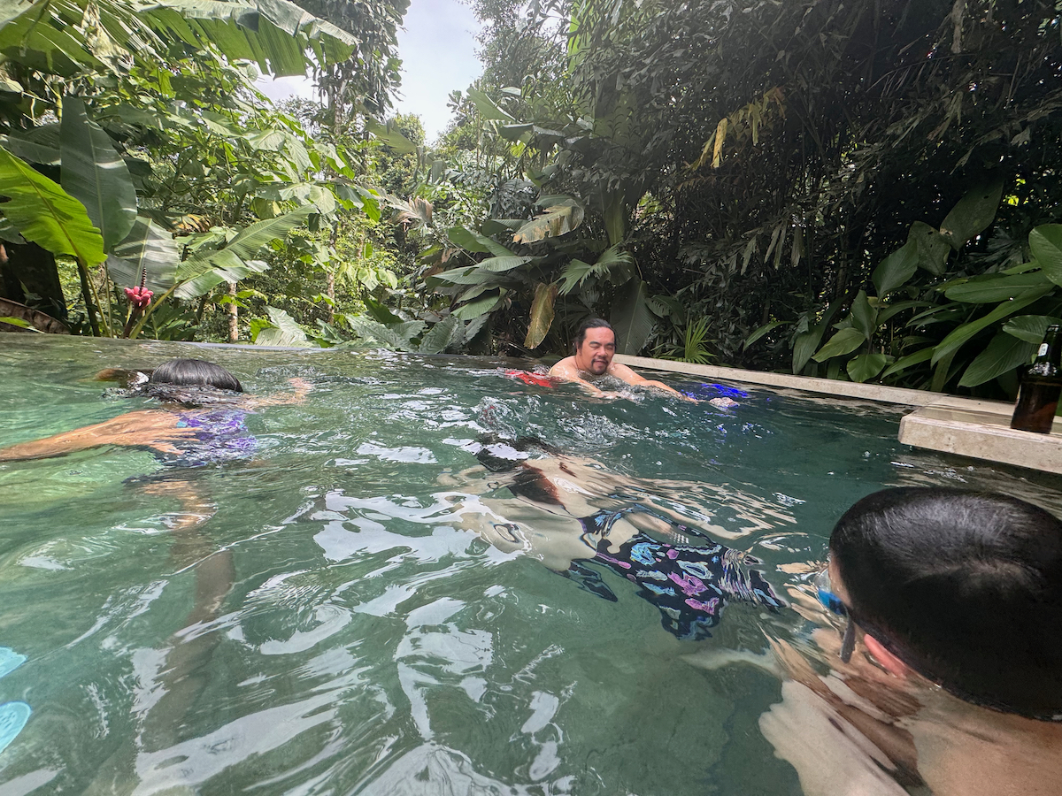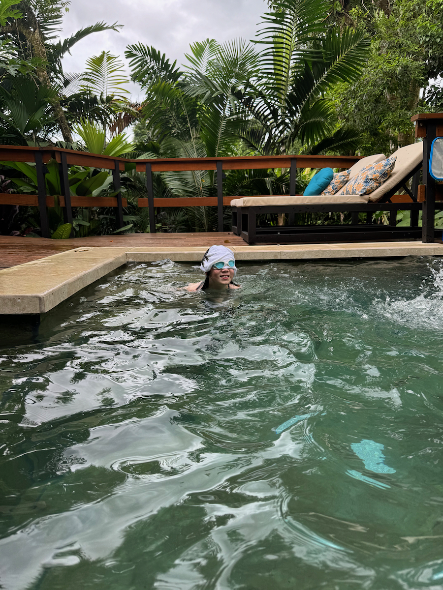 Then it started raining, like it does in rainforests. Magical. The rain hits the surface of the water and we see splashes of glow as it refracts the underwater pool light. It feels like we are inside the Avatar movie Pandora with the plants, rain, frogs sounds, bird sounds, insect sounds, etc. etc. It’s just a fantastic experience out here.