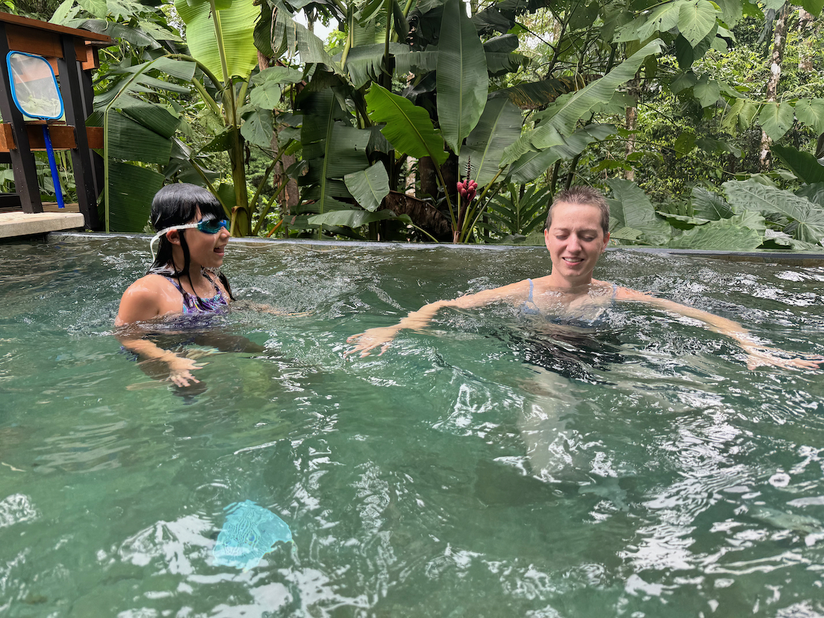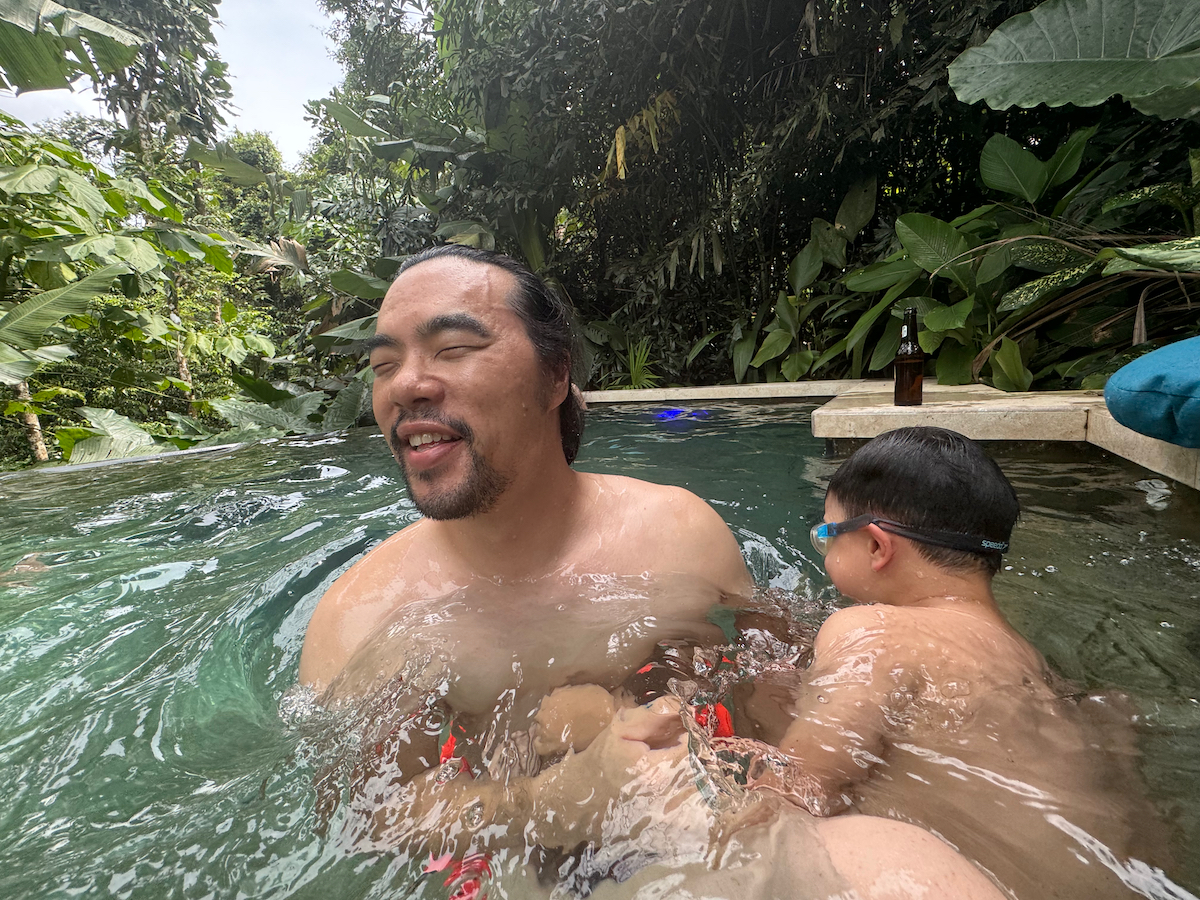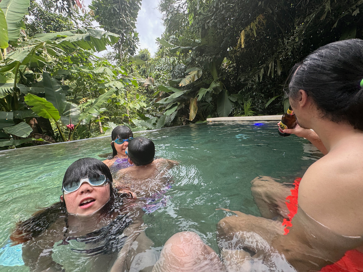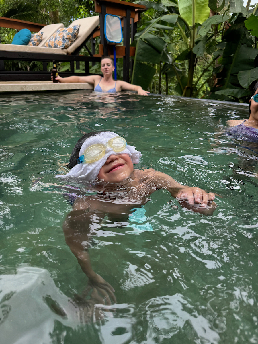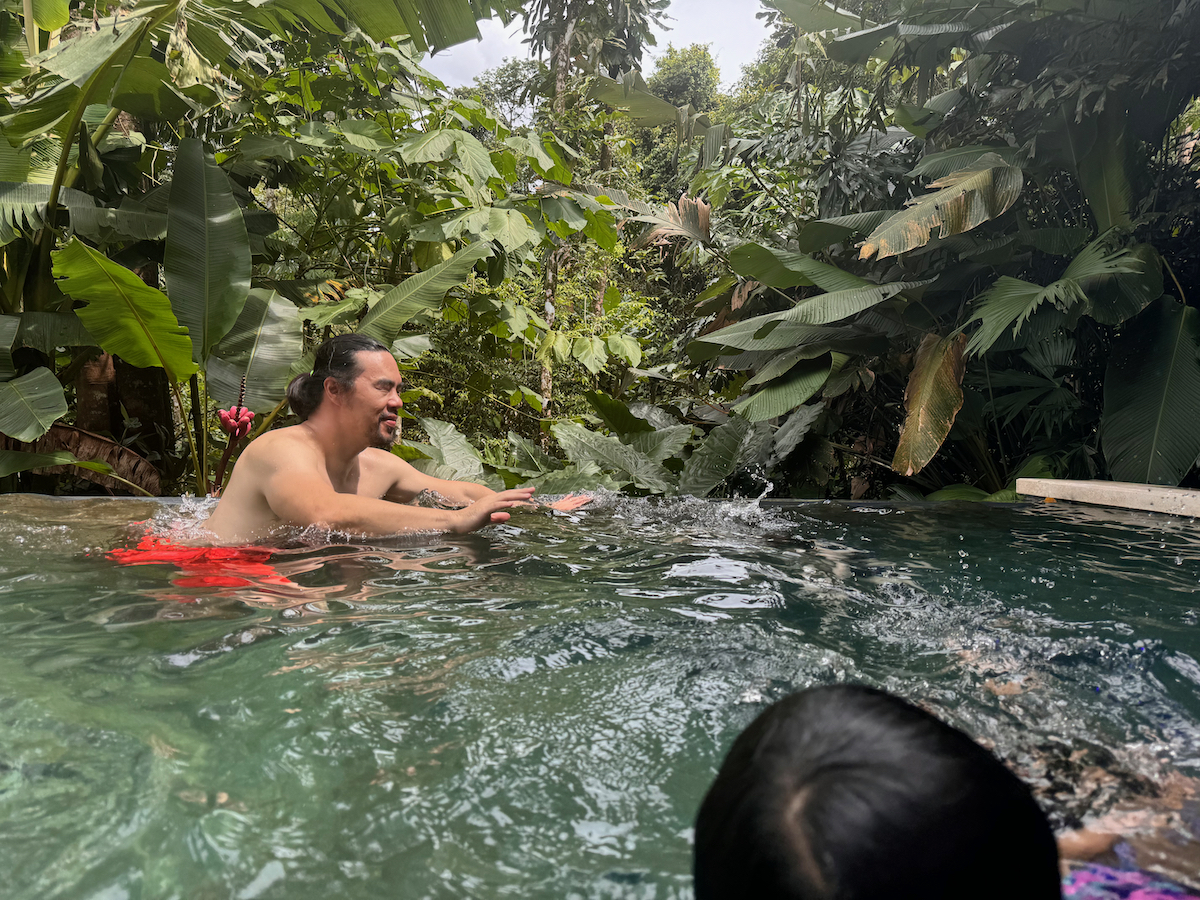 Then it started raining, like it does in rainforests. Magical. The rain hits the surface of the water and we see splashes of glow as it refracts the underwater pool light. It feels like we are inside the Avatar movie Pandora with the plants, rain, frogs sounds, bird sounds, insect sounds, etc. etc. It’s just a fantastic experience out here.