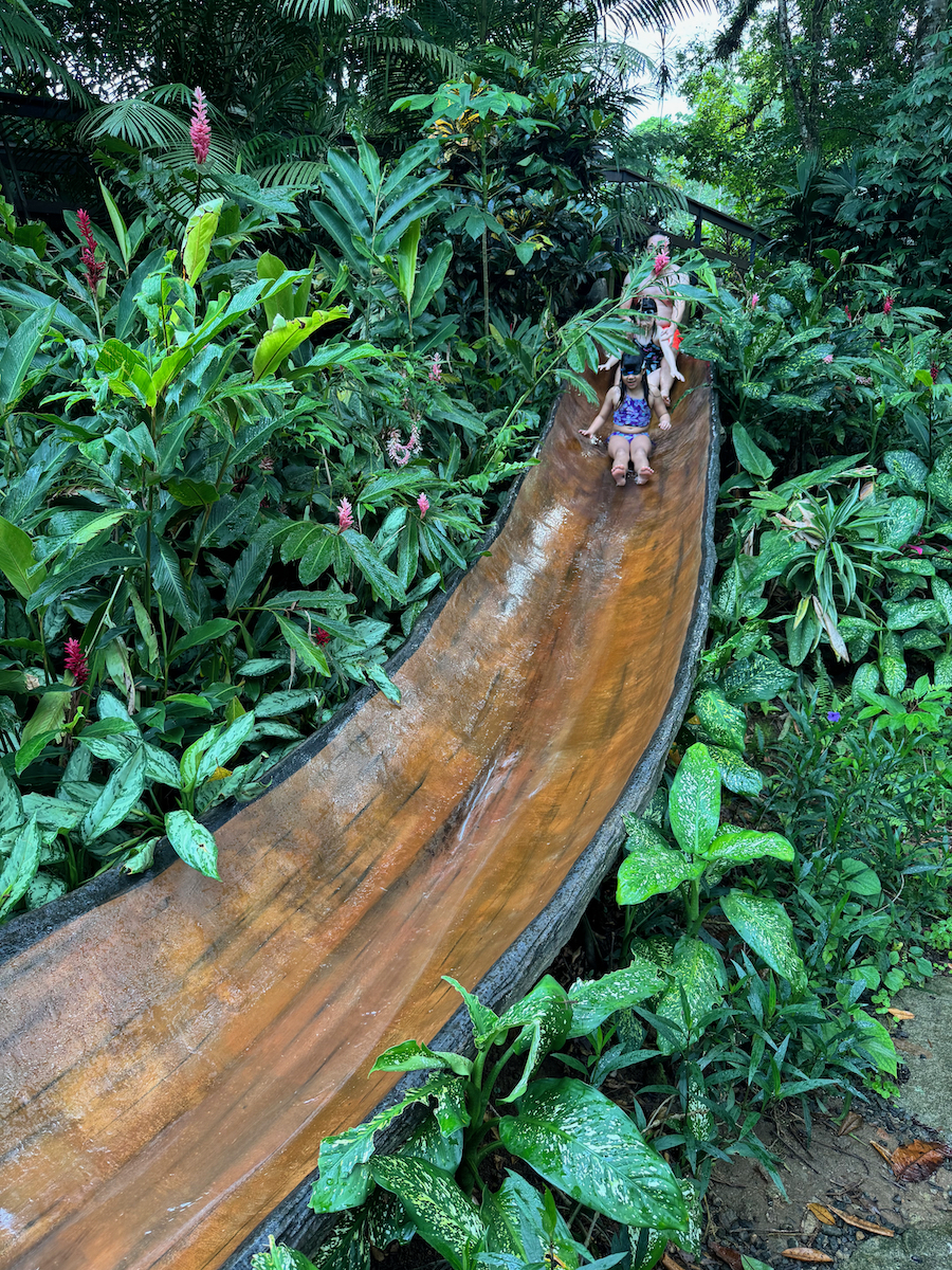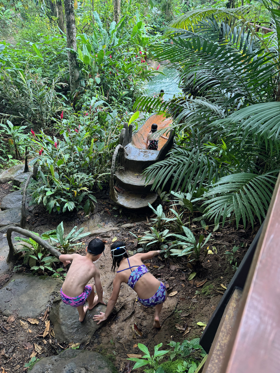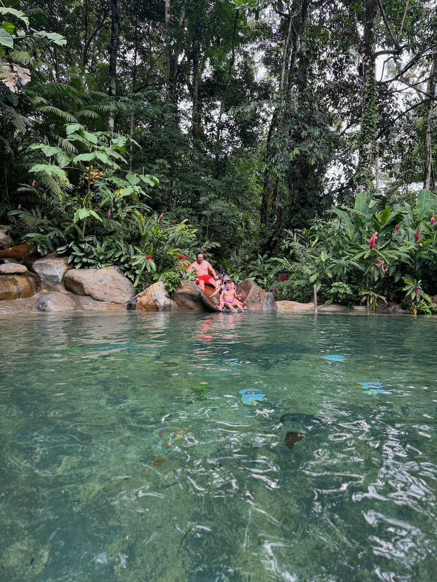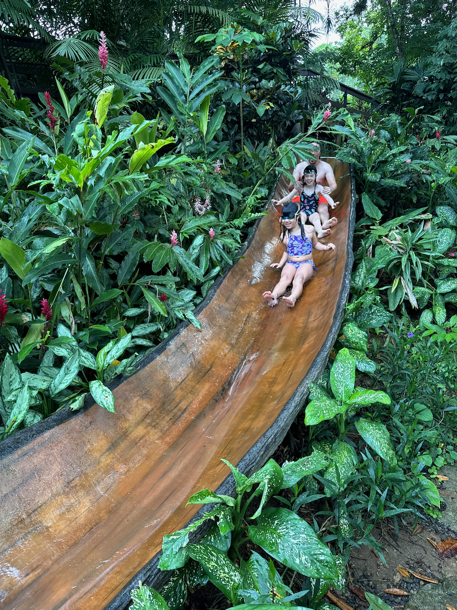From the cold slide pool, there was a little rocky path to the creek. At the creek, we saw another slide that stopped high above the water. I swam under the slide to check on the depth of the pool, then the kids urged me to go. Alright…let’s do this. The girls were brave and wanted to join me as well.