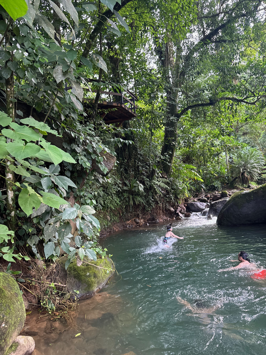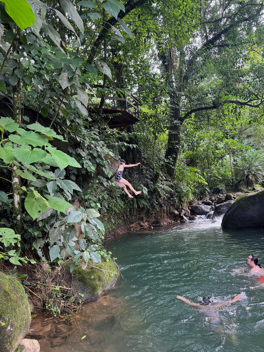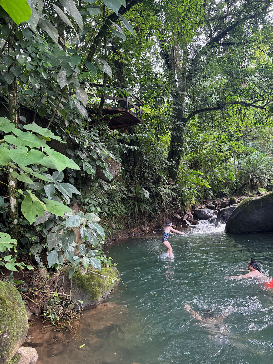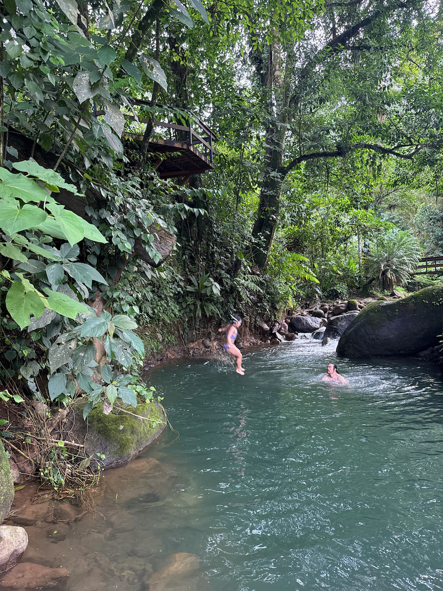 From the cold slide pool, there was a little rocky path to the creek. At the creek, we saw another slide that stopped high above the water. I swam under the slide to check on the depth of the pool, then the kids urged me to go. Alright…let’s do this. The girls were brave and wanted to join me as well.