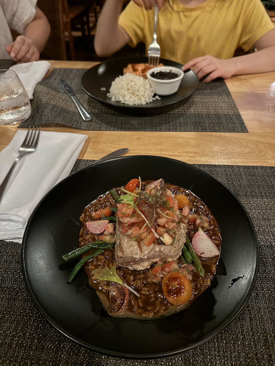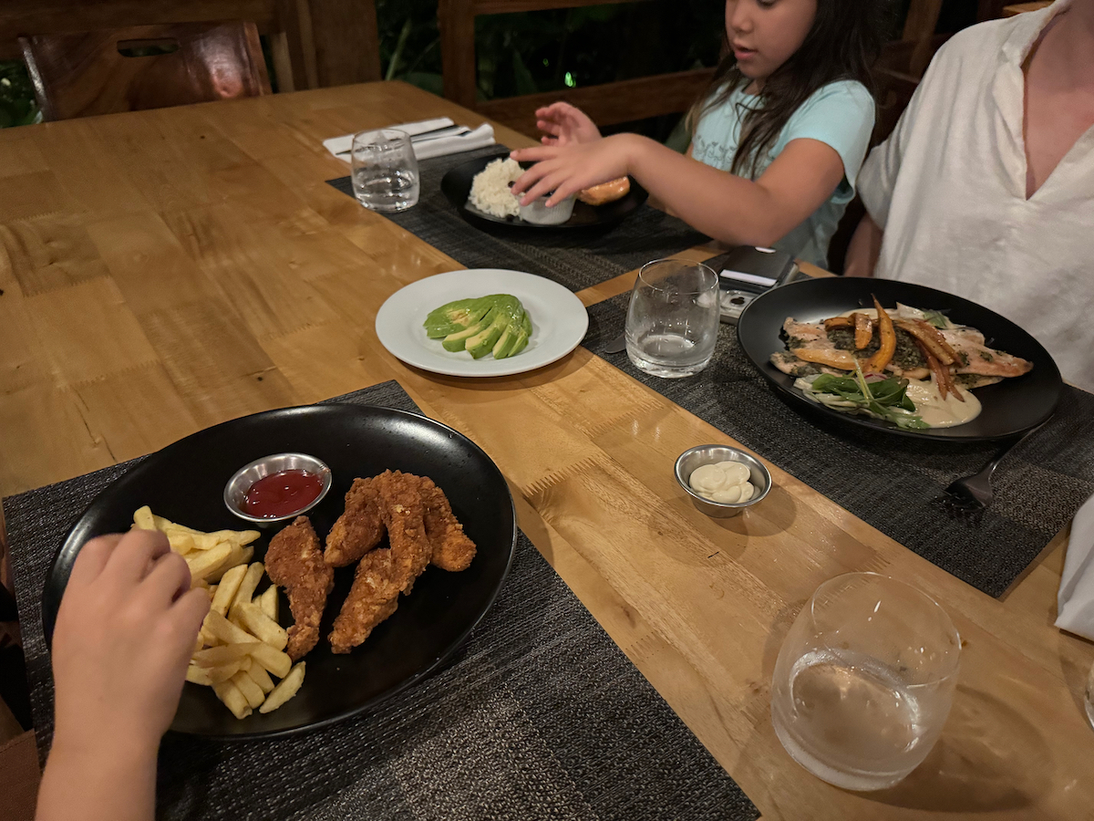 After all the complaining about food during lunch, tonight the girls are having salmon with rice and beans, and Little KL got chicken tenders with fries. No complaints about food tonight, but I think they are also hungry from playing in the water all day.