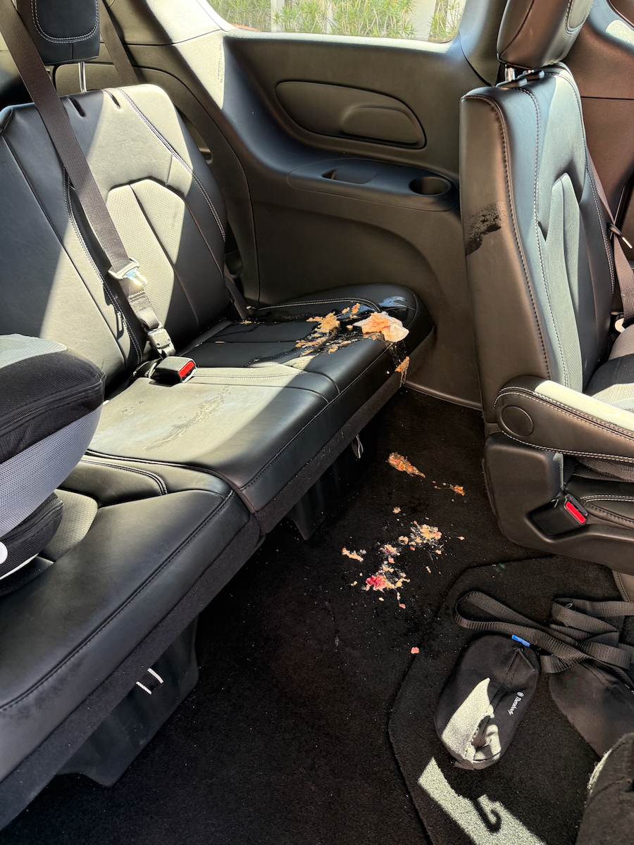 RL went looking for a gas station looking for cleaning supplies. Ah ma was sent into Mitch’s sushi looking for cleaning supplies. Mitch’s sushi gave us a roll of papertowel and some water. I went to work cleaning…this is a disaster. How are we going to get the smell out of the car?! Shit.