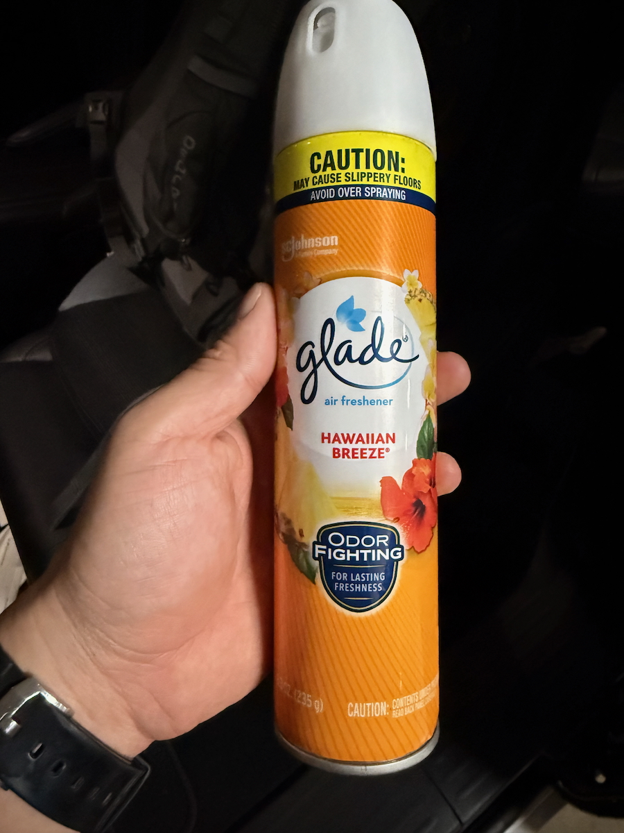 ABC Store didn’t have Febreeze, so got the next best thing to try to clean the smell out of the car some more. Hawaiian Breeze scent, how fitting.