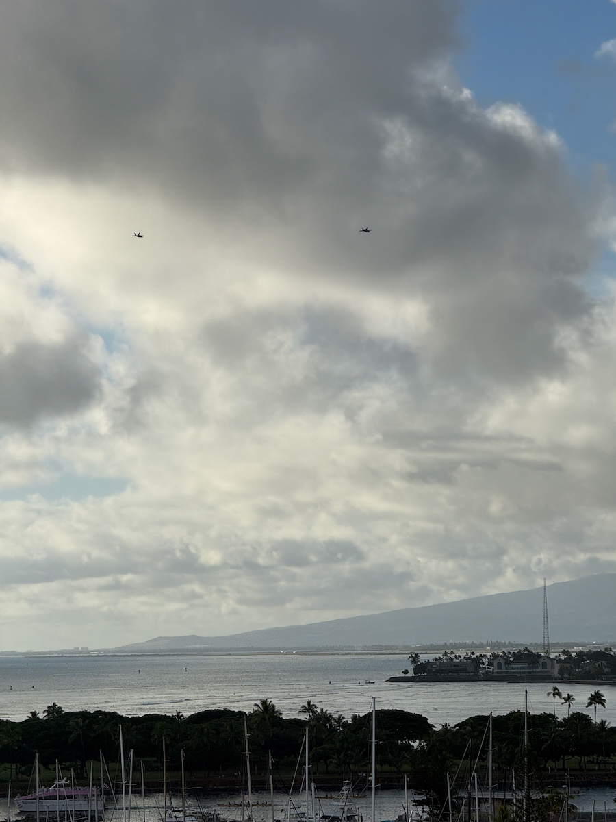 Post swim time, I sat on the balcony to do some blogging. While sitting there, I heard really loud jets overhead, and saw these two F22s doing exercises. They are Really Really loud.