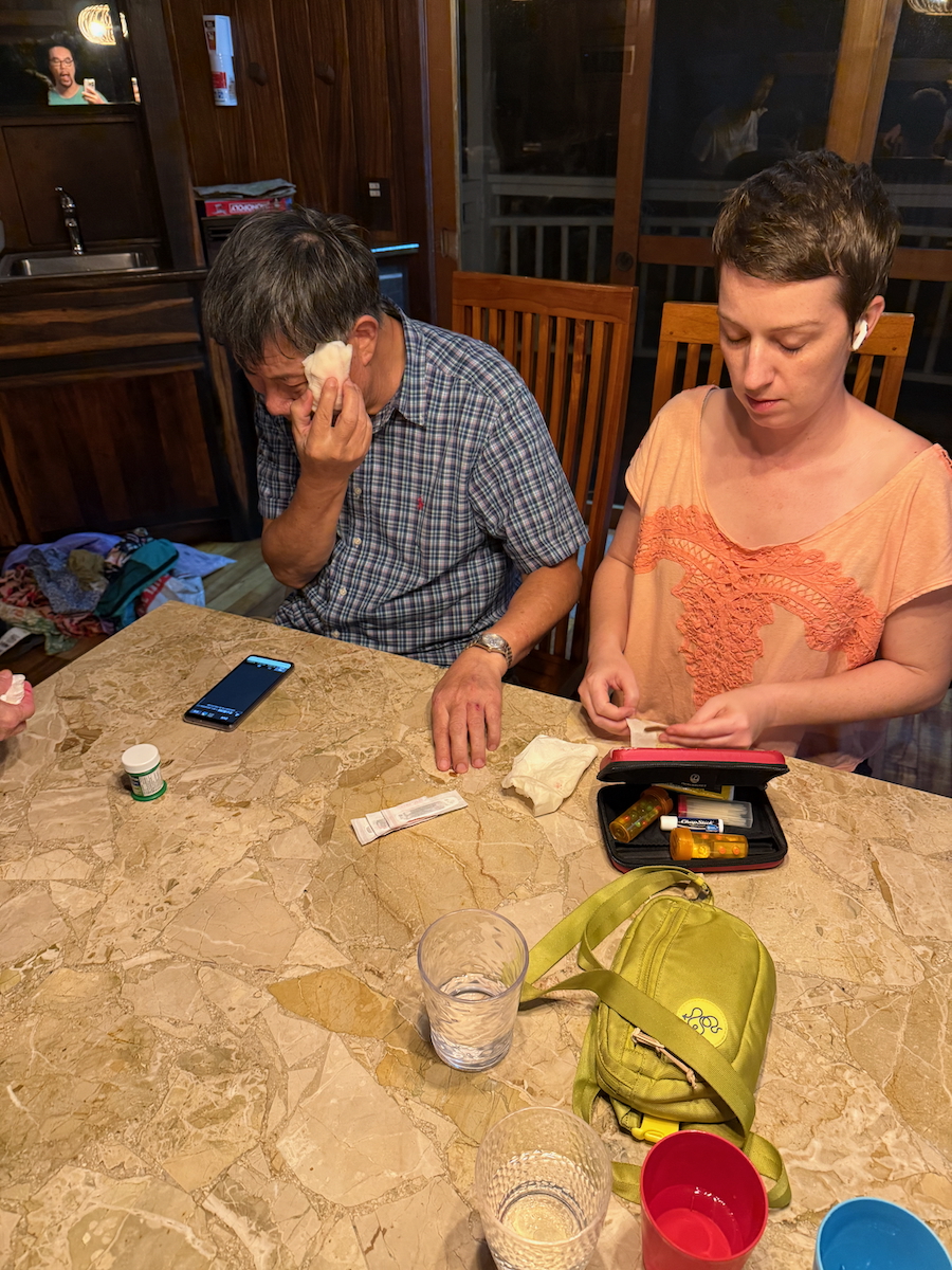 Wound care nurse RL goes to work. The cut isn’t too bad, but our stress level is high. It’s more of the he’s lucky that he escaped this fall with such little injury. I can’t bear to think about what would have happened if where he fell happened to sit a larger and shaper rock….Either way, he’s not allowed to smoke there by the beach anymore.