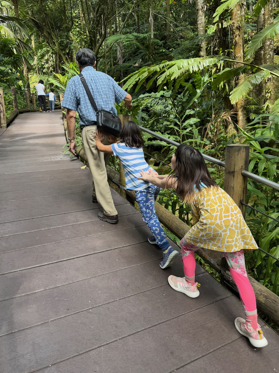Girls helping ah gong up the incline.
