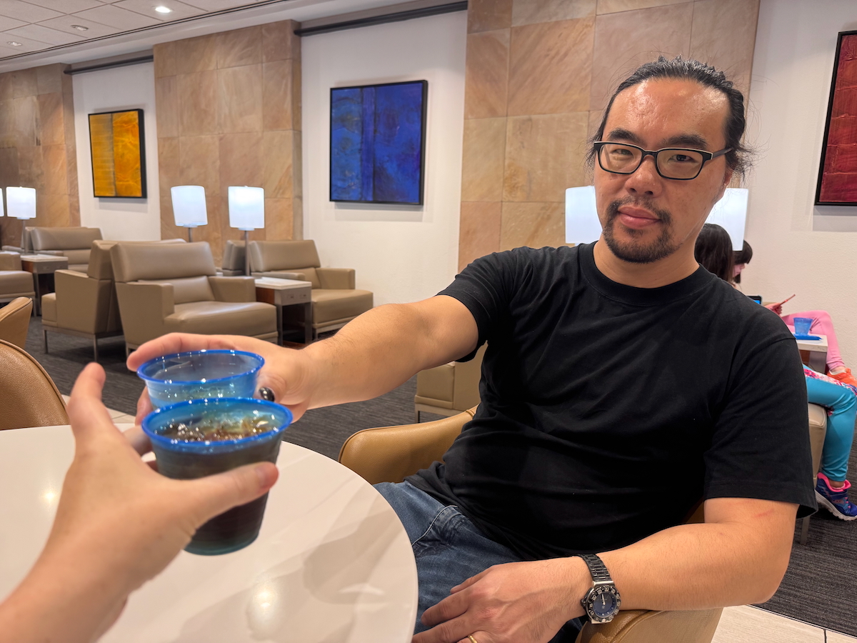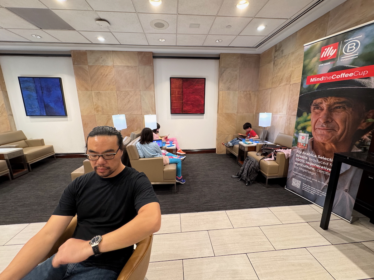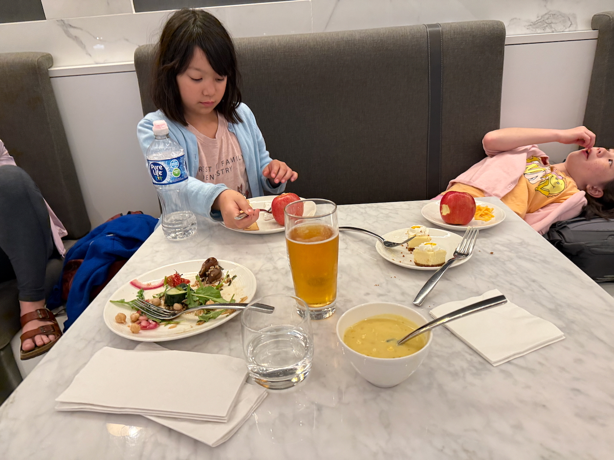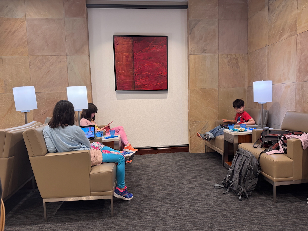 United Club lounge. We are flying business class this trip. My old man back and RL’s leg nerve pain just pushed us over the edge to spring for it. We haven’t told the kids yet, and they didn’t pick up on the hints yet when we checked in at the business class counter. It’ll be a nice surprise for them, especially the older two who are more aware of the luxuries in life. I hope this doesn’t spoil them…too much.