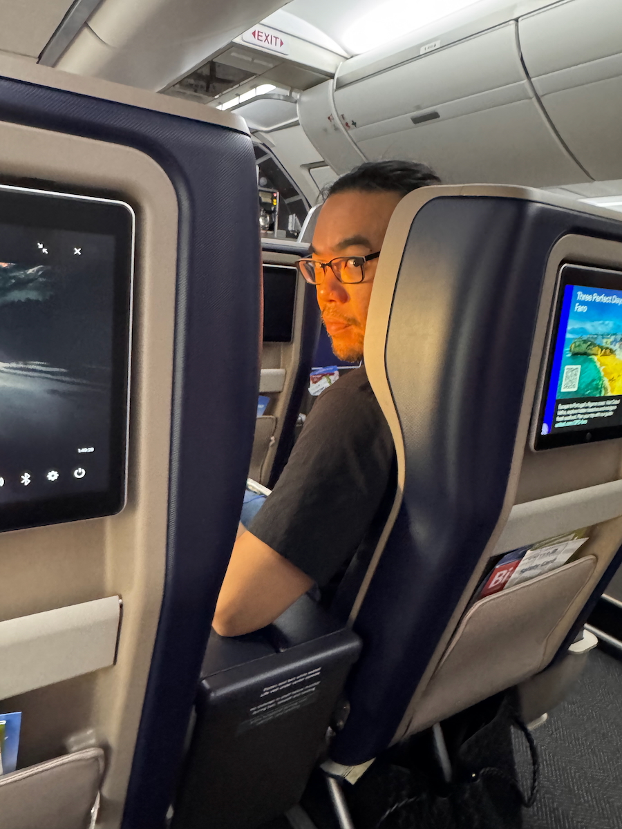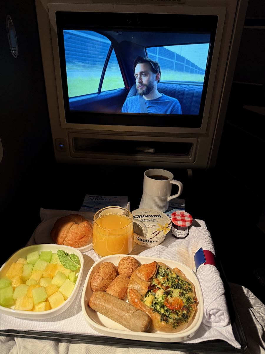 Breakfast. A Real Pain, love Kieran Culkin as an actor. Lie-flat seats are great, but sleeping on an airplane is still not great. Still grateful to have these seats, totally worth it for my old man back.