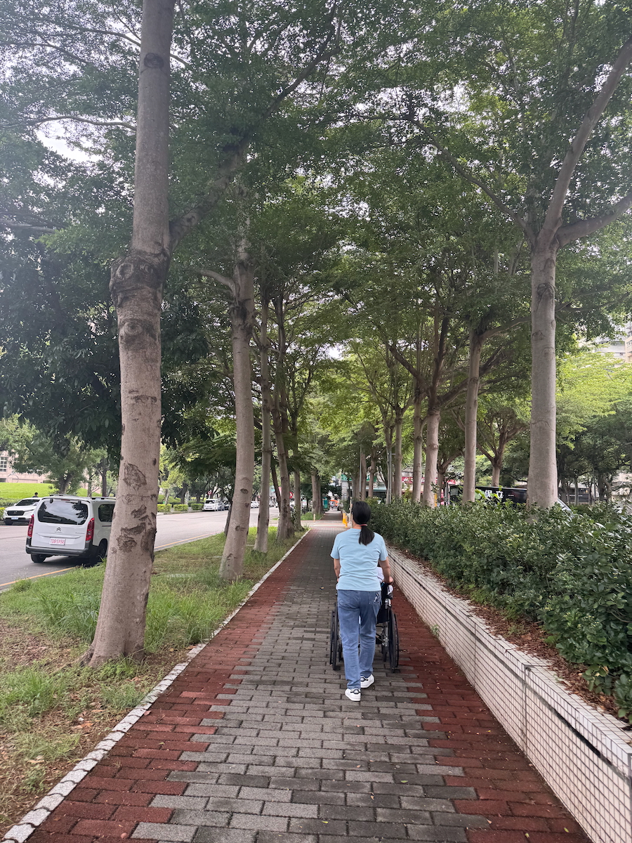 Ah zo with her nurse assistant pushing her in the wheelchair.