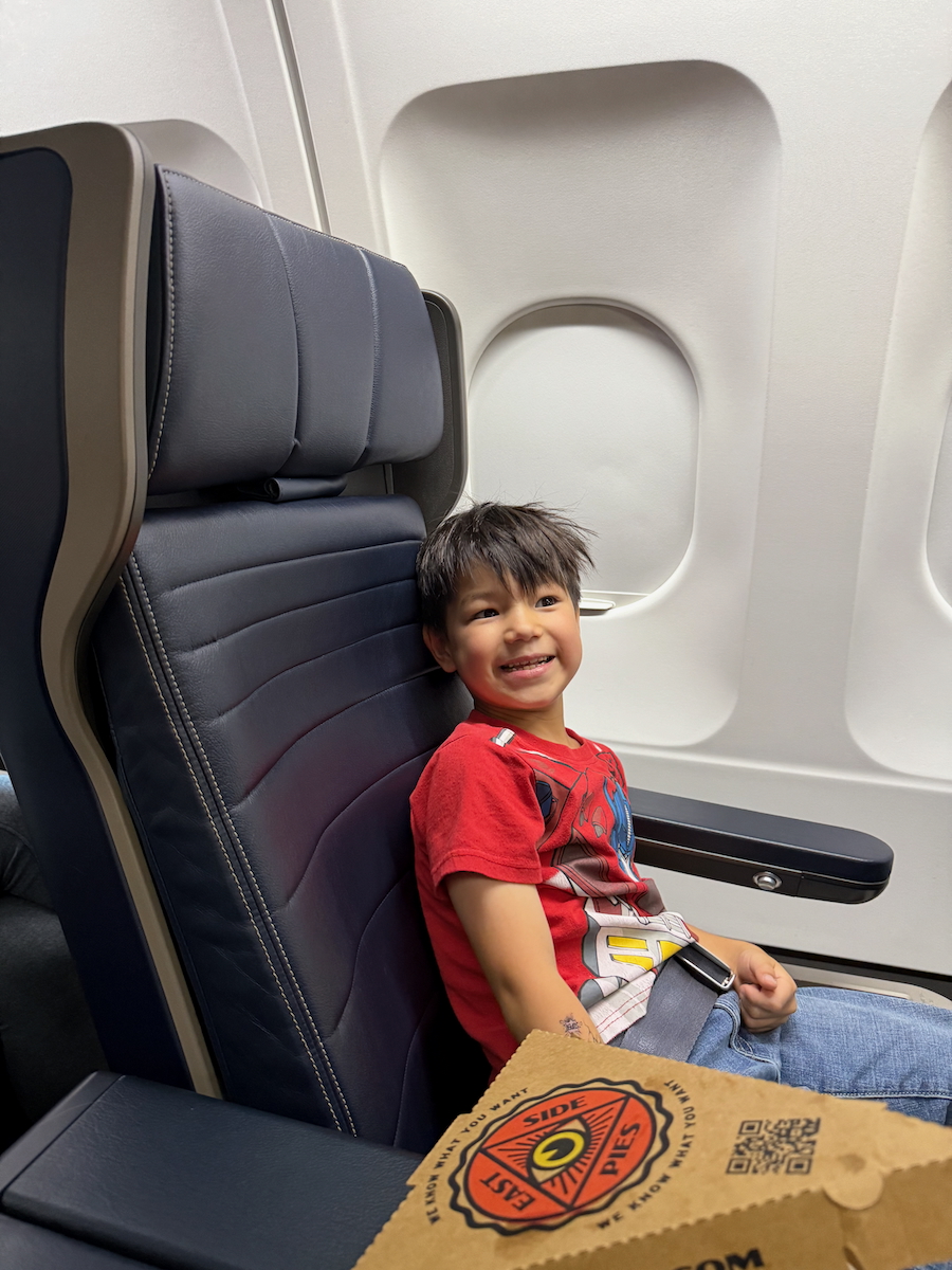 Probably doesn’t care that much about business class seats. Perhaps will appreciate them later when we take off and he can sleep laying flat.