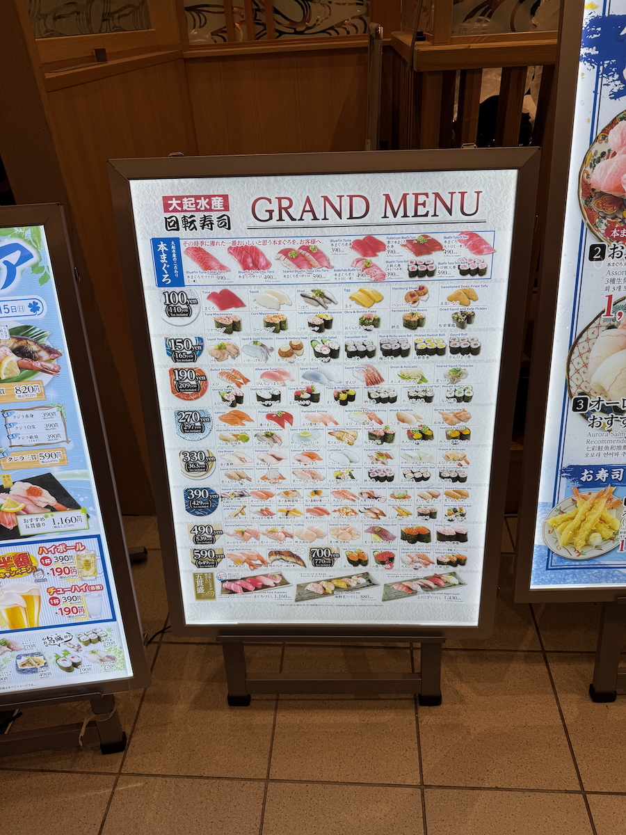 Let’s eat! Our table isn’t actually next to a rotating sushi belt, so everything was ordered via a tablet. They actually do have a conveyor next to us that could in theory could send items to us, but it wasn’t being used and all of our food was brought to us old school style, by a human.