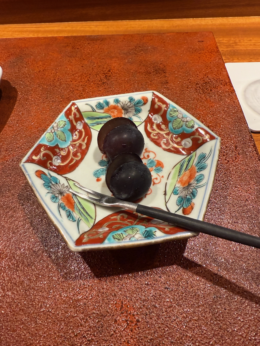 Simple dessert of two grapes per person for our dessert. It’s about almost $700 for all 5 of us to eat here including our drinks. All things considered, not super bad for a Michelin starred restaurant in Japan. Would highly recommend for the special experience.