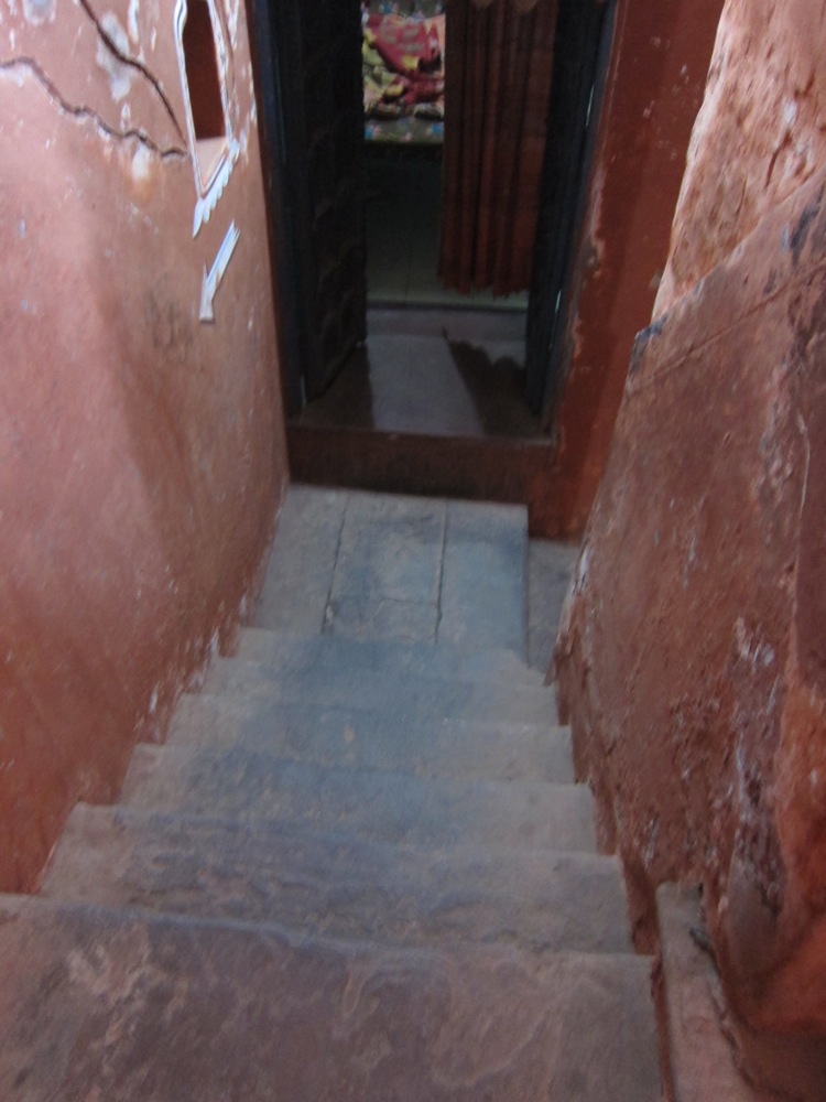Down the stairs of the guest house.