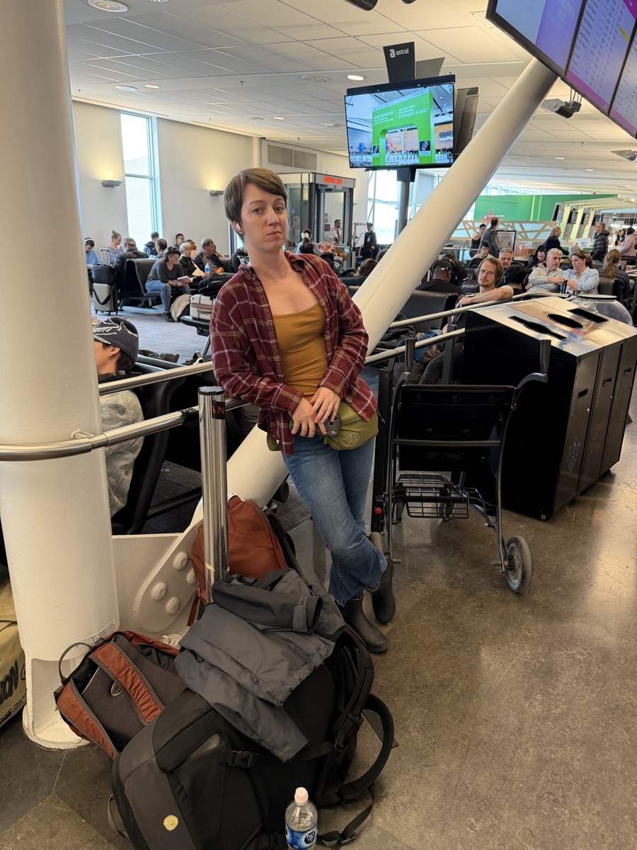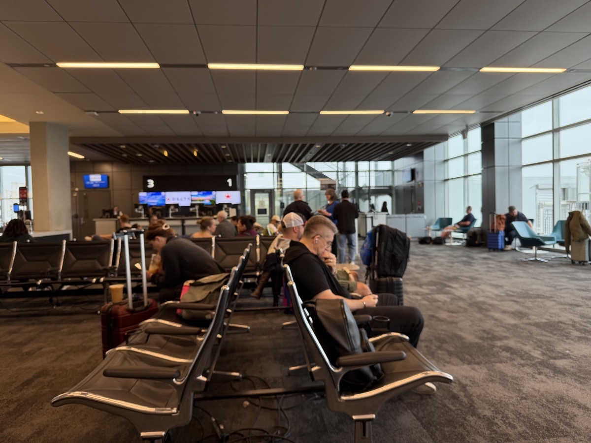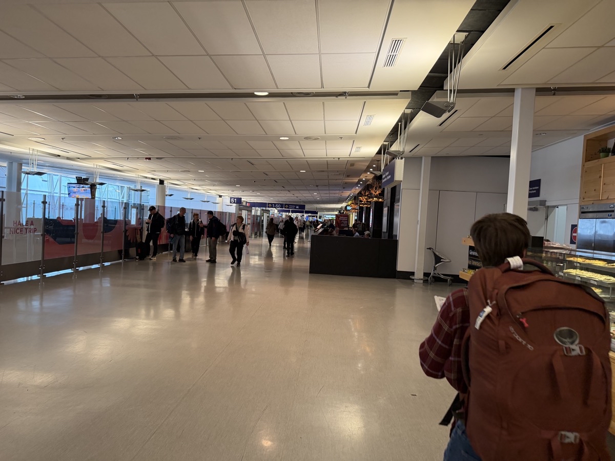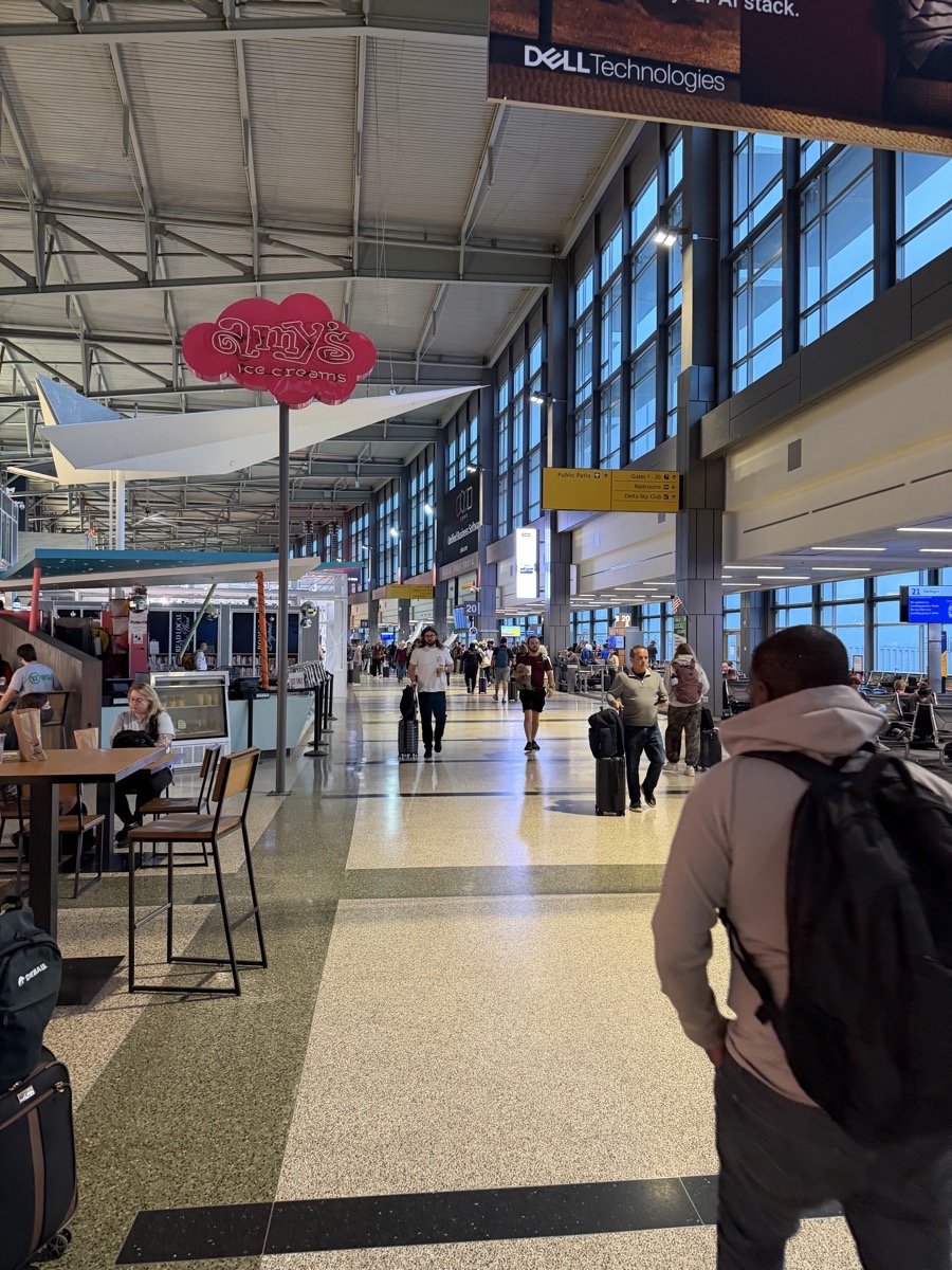 We are both tired. Even though it’s only a little bit past 7am, we both feel exhausted. Due to TSA’s shutdown and now being funded again, they are still short staffed. The airport recommended that we show up 3 hours early for an international flight. But, since our flight isn’t until 9:40am, I figured we’d miss the very heaviest travel time of before 7am. Sure enough, the security line wasn’t too bad.