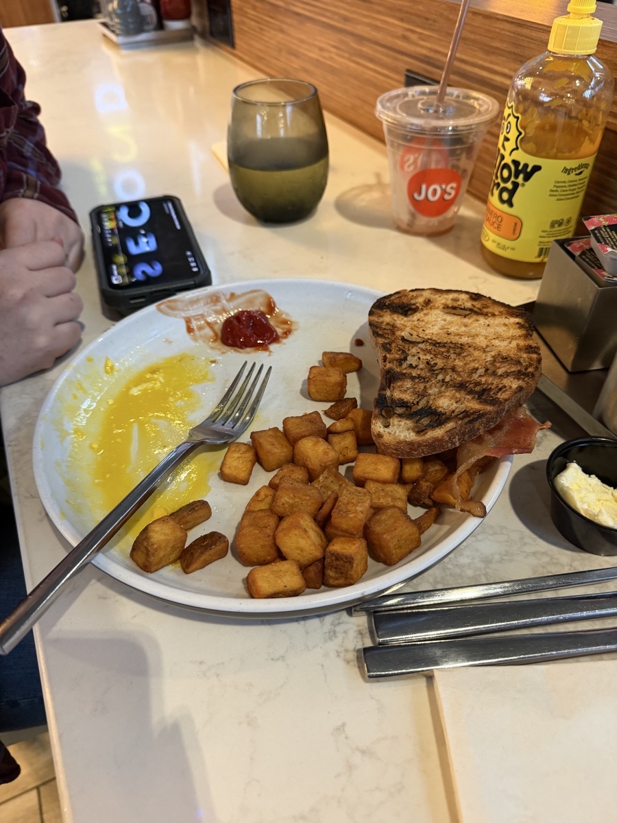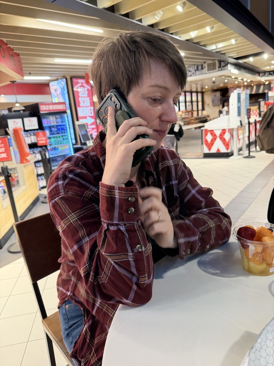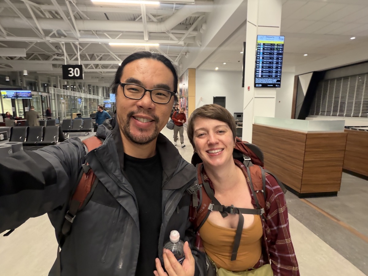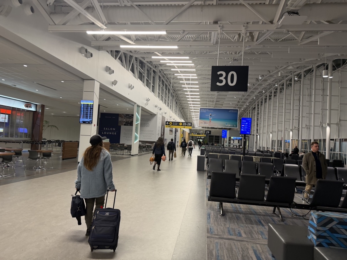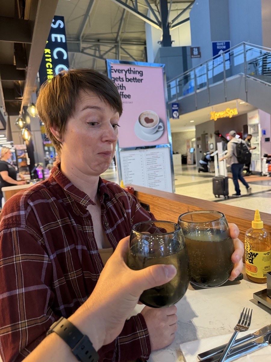 We are both tired. Even though it’s only a little bit past 7am, we both feel exhausted. Due to TSA’s shutdown and now being funded again, they are still short staffed. The airport recommended that we show up 3 hours early for an international flight. But, since our flight isn’t until 9:40am, I figured we’d miss the very heaviest travel time of before 7am. Sure enough, the security line wasn’t too bad.