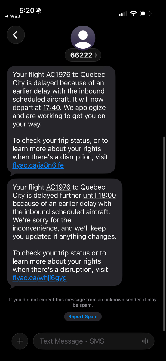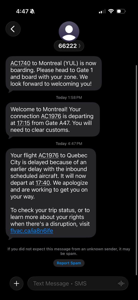 And delayed again….and then some more after this. We ended up leaving over an hour after original schedule. But insult on top of injury was that the gate agent made me check my backpack saying that it was too big for carry on and that it was a full flight and had no space for overhead bins. Yes, this same backpack that I’ve used to travel around the world extensively as a carry on for 15 years is too big of Air Canada…no it isn’t!! Either way, gate checked my bag and now I’ll have to pick it up at the luggage when we arrive at Quebec City. The worst part is that when we got on the plane, there were TONS of overhead space leftover for carryons…so made me check my backpack for nothing. I’m pissed.
