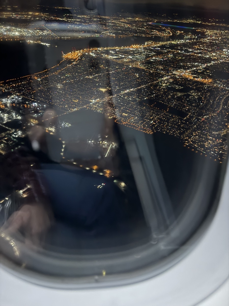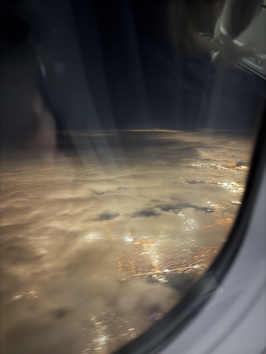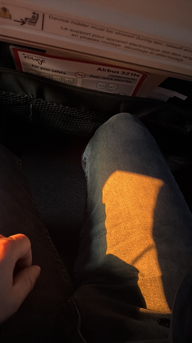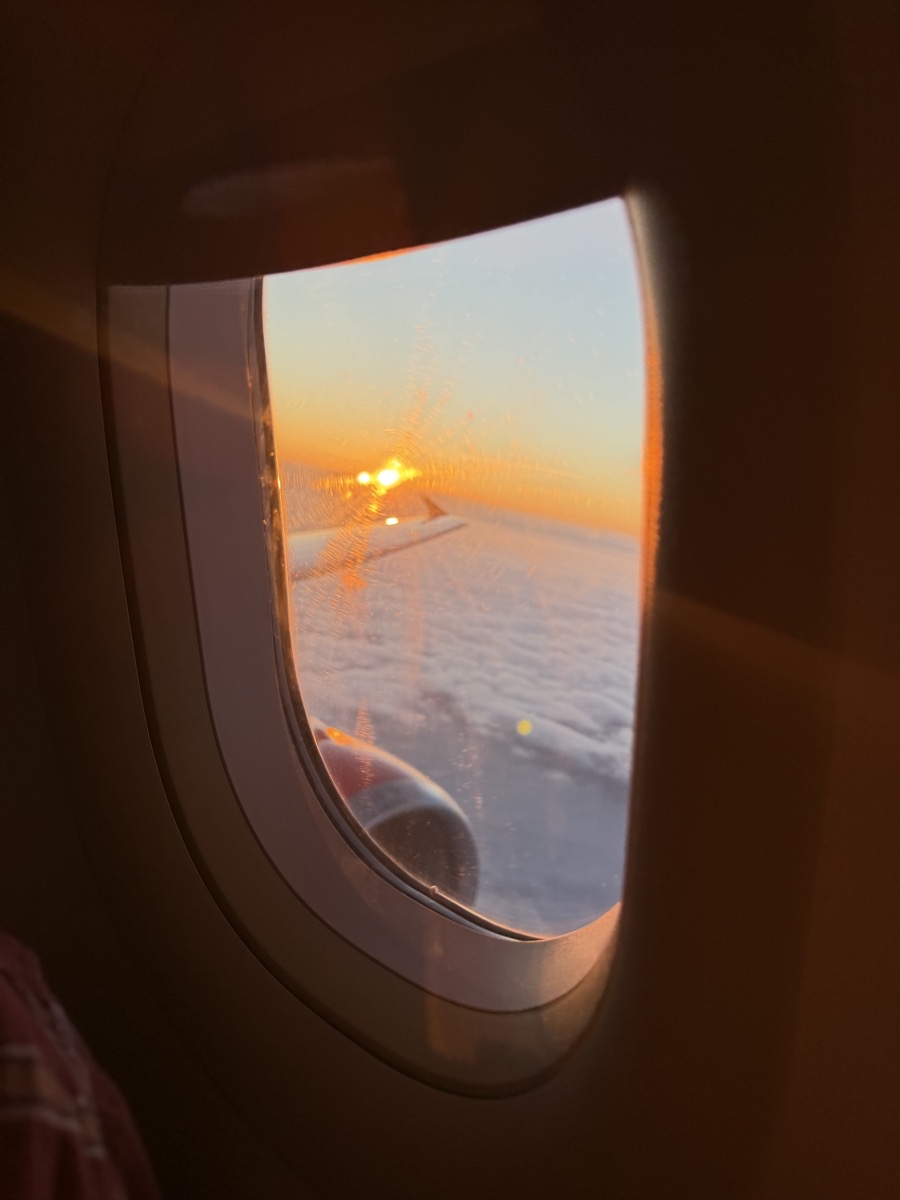 It’s been a really long travel day. Looking forward to this last one hour leg. It’s also golden hour and the sun was beaming beautiful golden light into the cabin.