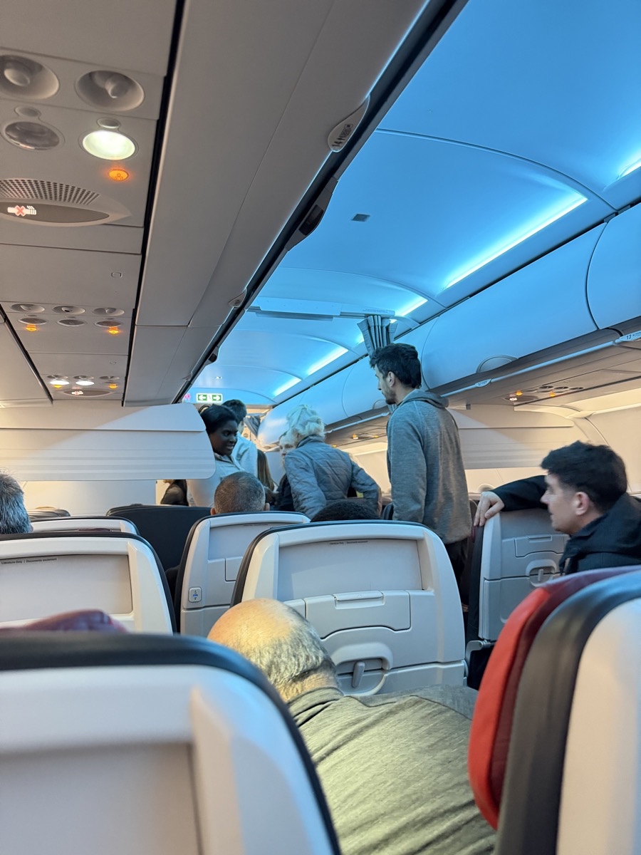 Bathroom line now that the bathroom is open while we fuel up. The captain announced the plan. We fuel up, and then we fly to Quebec City and we try again with the weather expecting to clear up. The flight attendant said that this was her first aborted landing in over 2 years of flying. Honestly…I feel a little uneasy about this flight. I felt that aborted landing was a little too unsafe and too close for comfort. The fog was literally so thick I saw the runway lights a split second before I realized we were over the runway…eek. Fingers crossed.