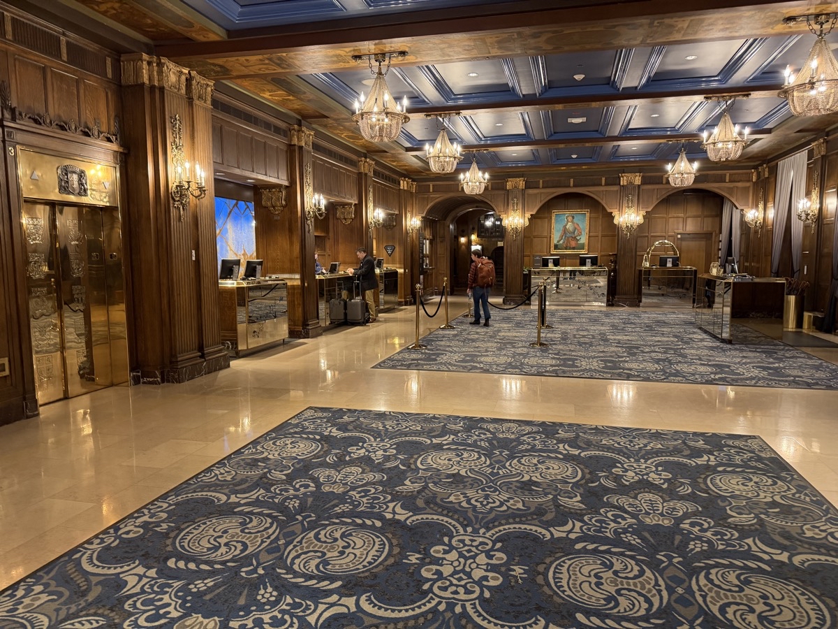 The lobby is pretty empty since it’s so late. It’s 11:20pm, we are tired.