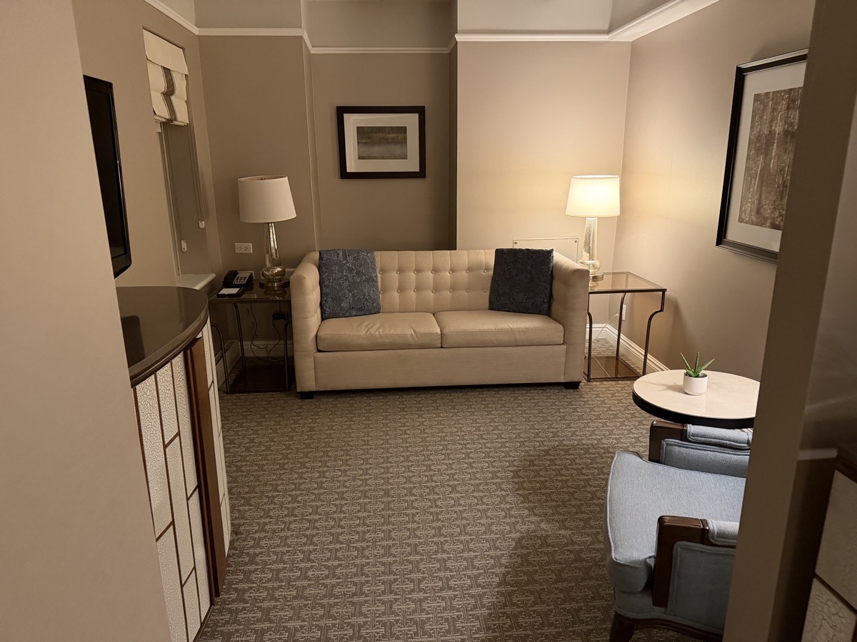 The decor is a little bit tired, but we do get a separate living room which is nice.