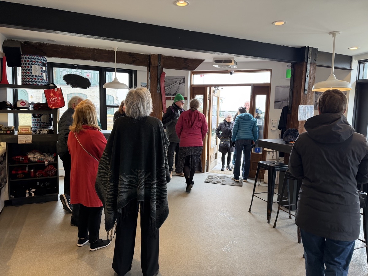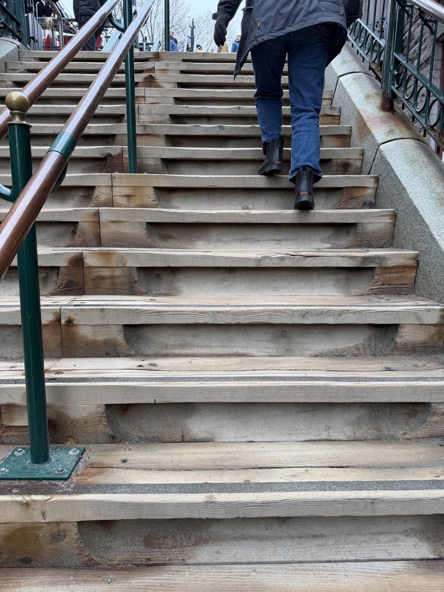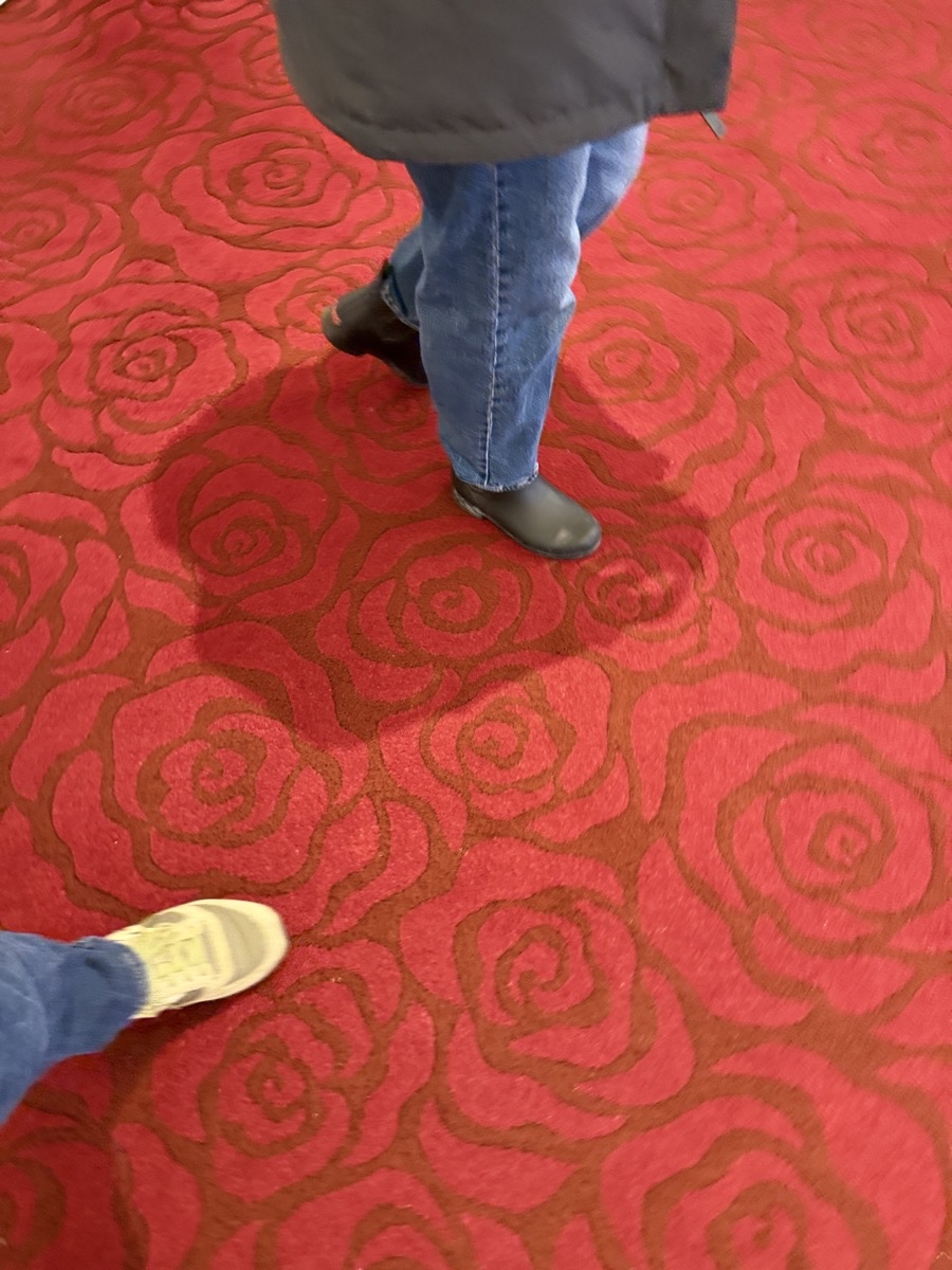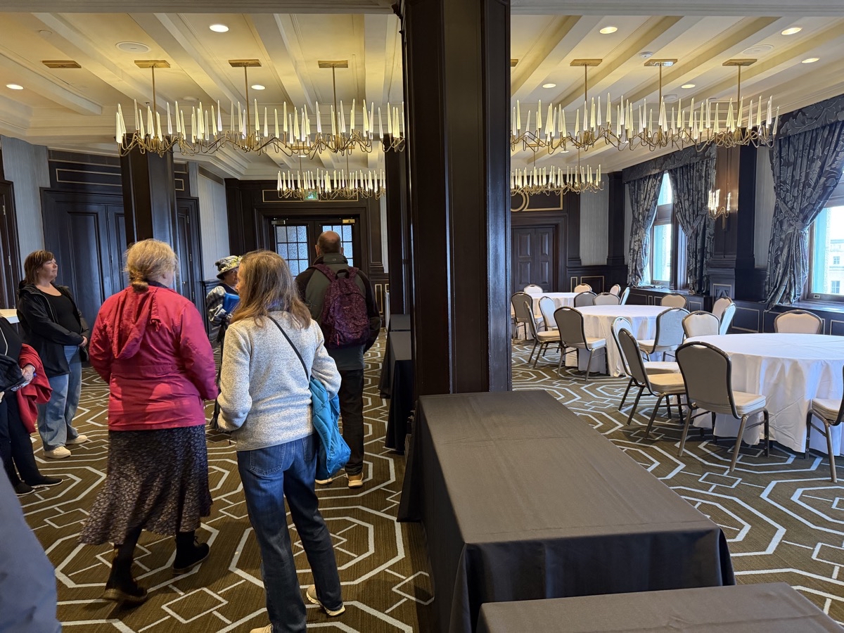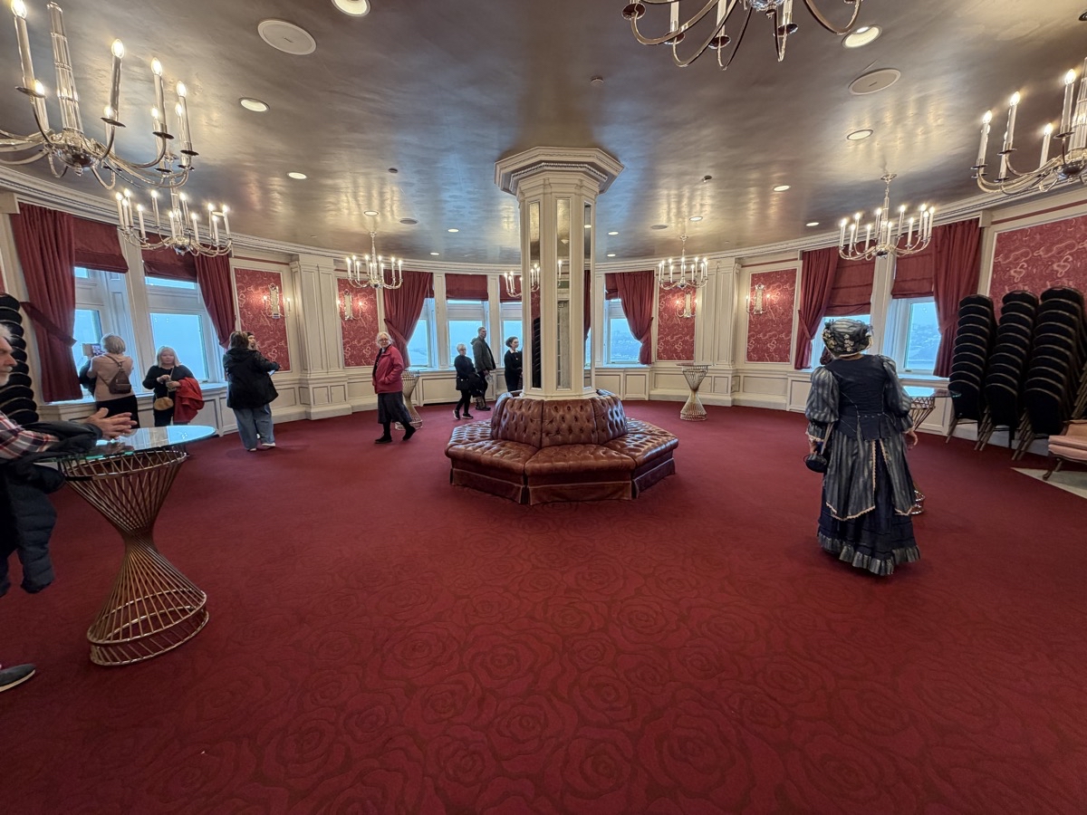 It’s 1pm, time to start our hotel tour. The tour starts outside on the boardwalk, it’s sprinkling a little bit and it’s windy and cold.